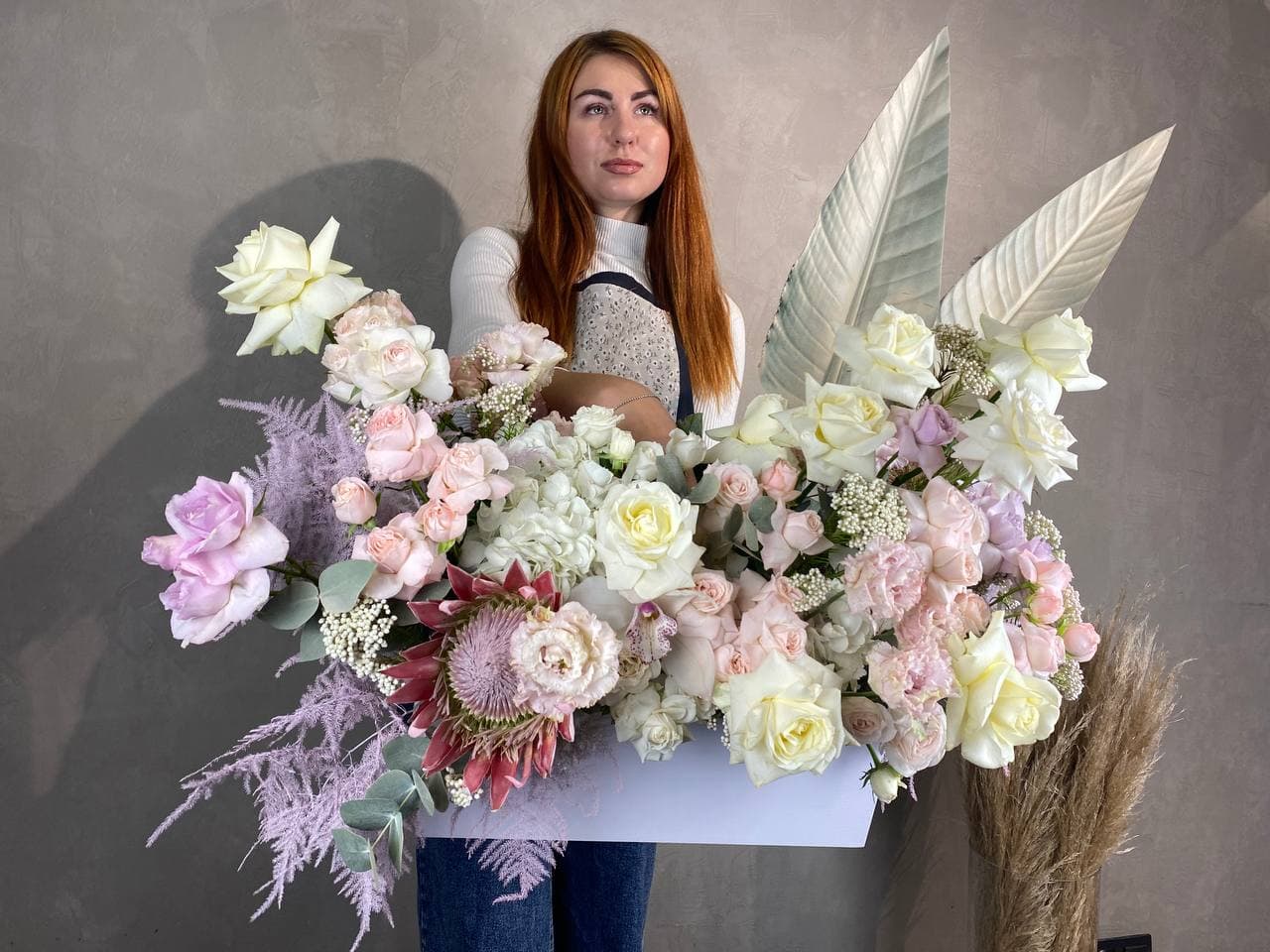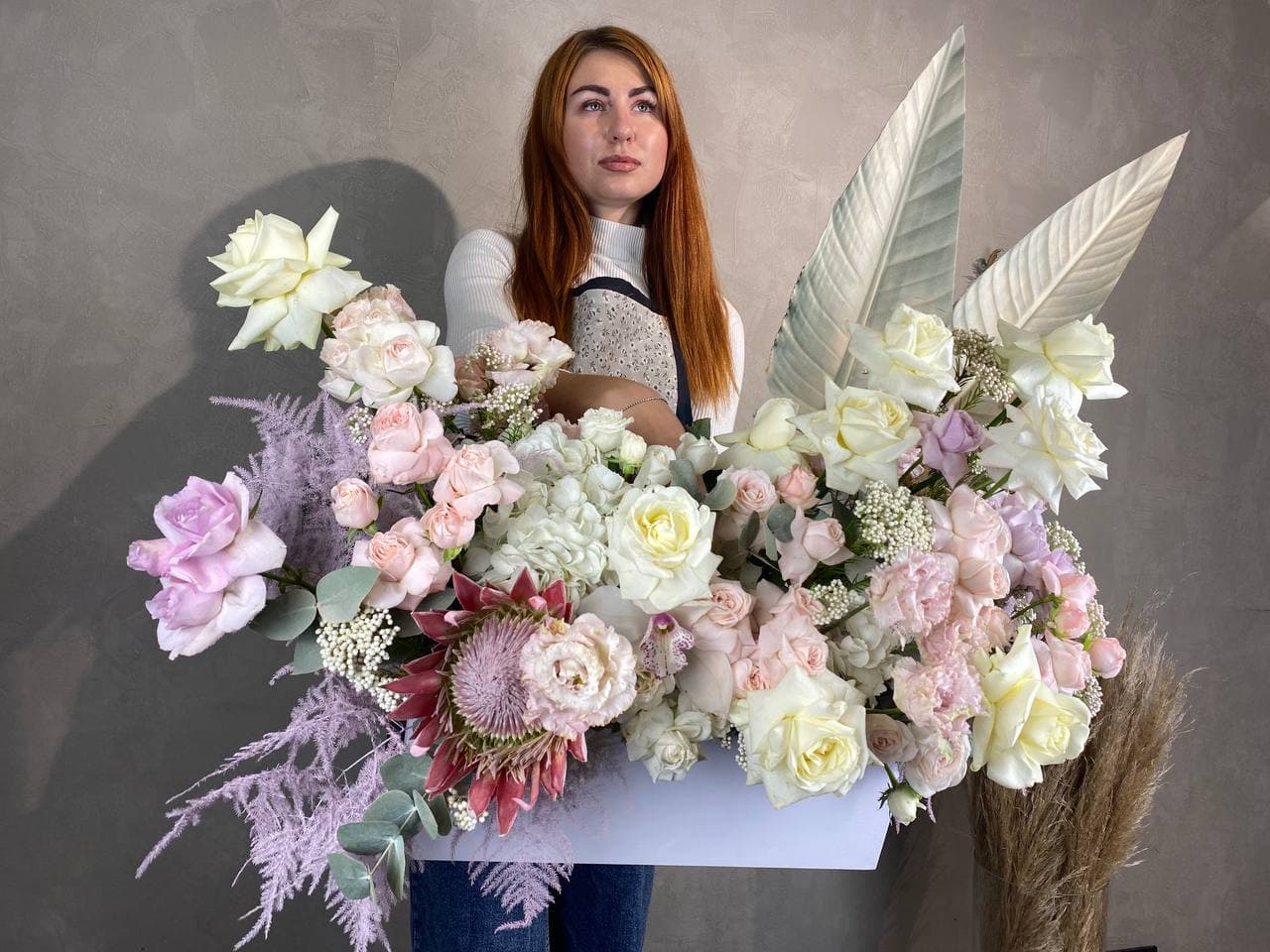 Сине-фиолетовая гамма с переходом в лавандовые и пыльно-розовые оттенки создает глубокую многослойную палитру. Пионовидные формы и воздушная гортензия дают объемную текстуру, а эвкалипт добавляет графичности.