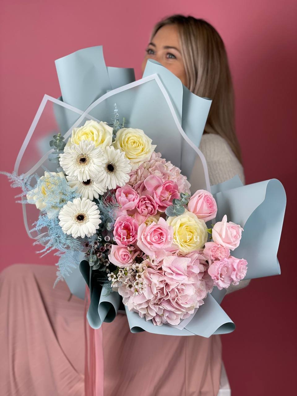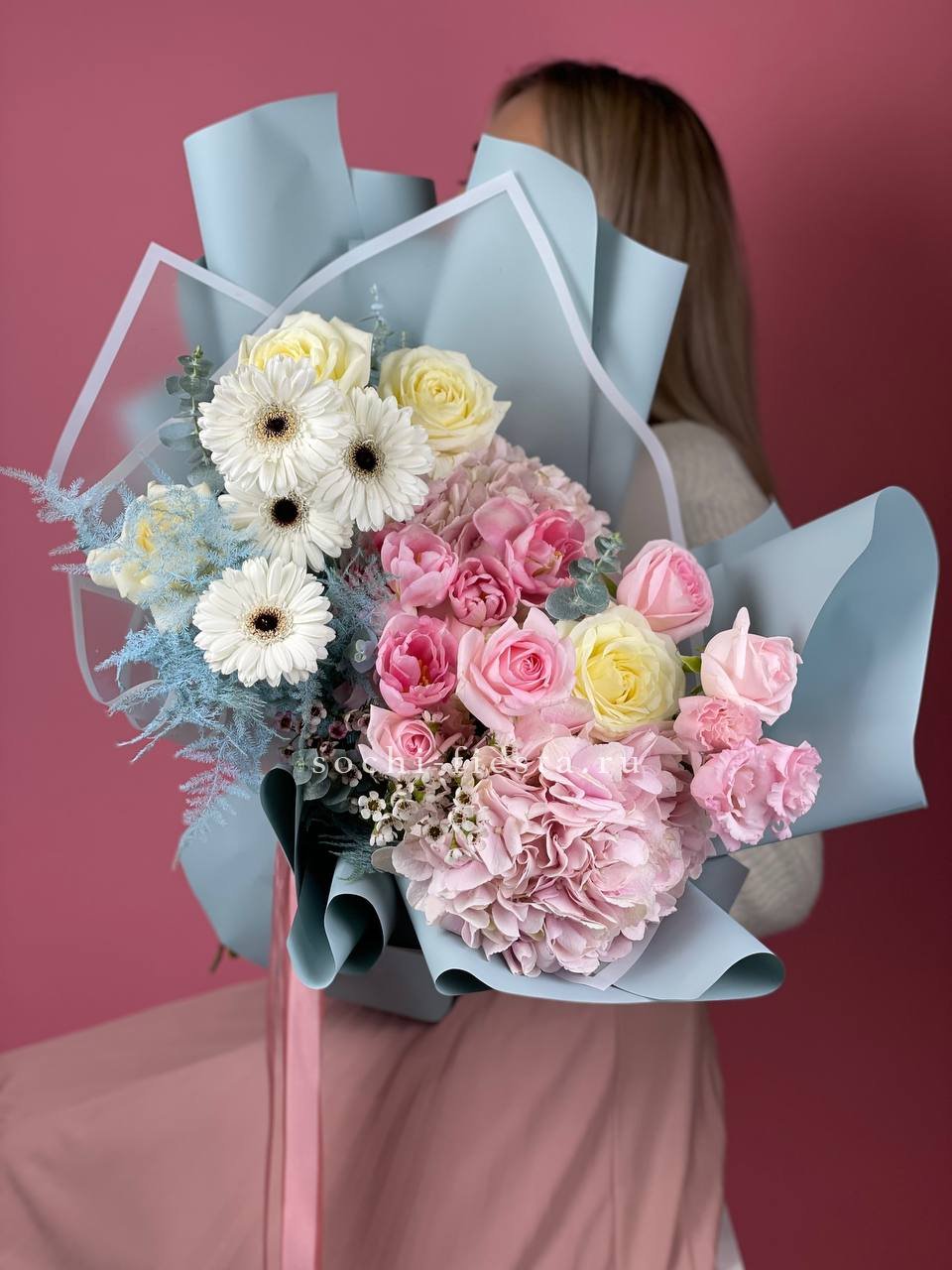 розы, кустовые розы, гортензия, маттиола (или аналог вне сезона), эустома, эвкалипт, лента, дизайнерская упаковка.