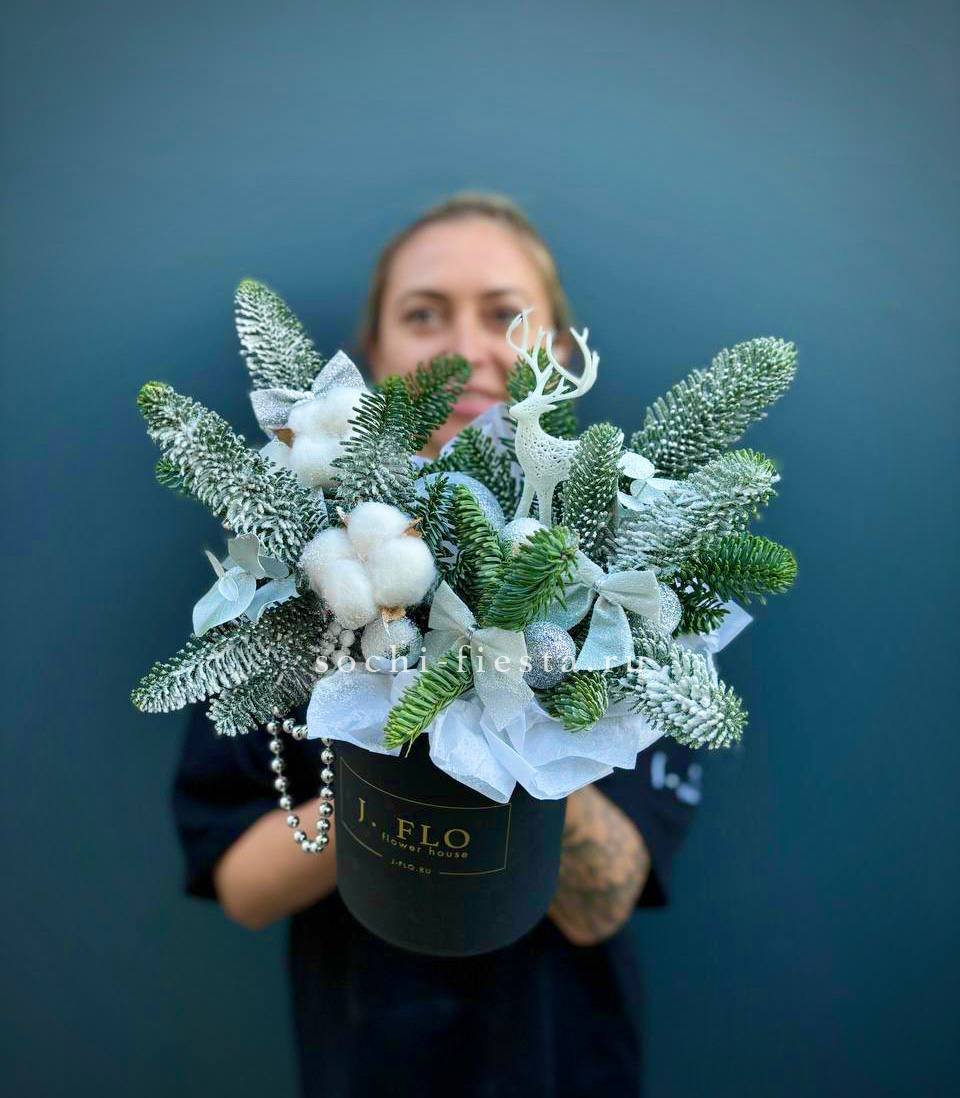 Компактная композиция в белом цилиндре с ветвями нобилиса и праздничными украшениями. Сдержанная цветовая гамма и аккуратная форма подходят для современного интерьера или рабочего стола.