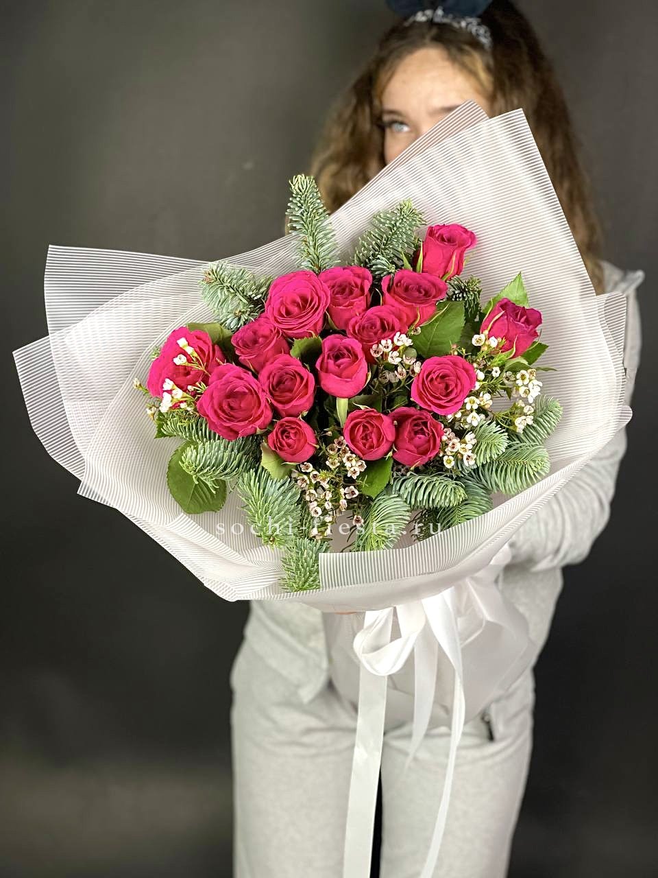 Пятнадцать роз встречаются с веточками нобилиса в плотном зимнем миксе. Хамелациум добавляет воздушности между бутонами и хвоей. Яркий праздничный акцент для дома или в дар.