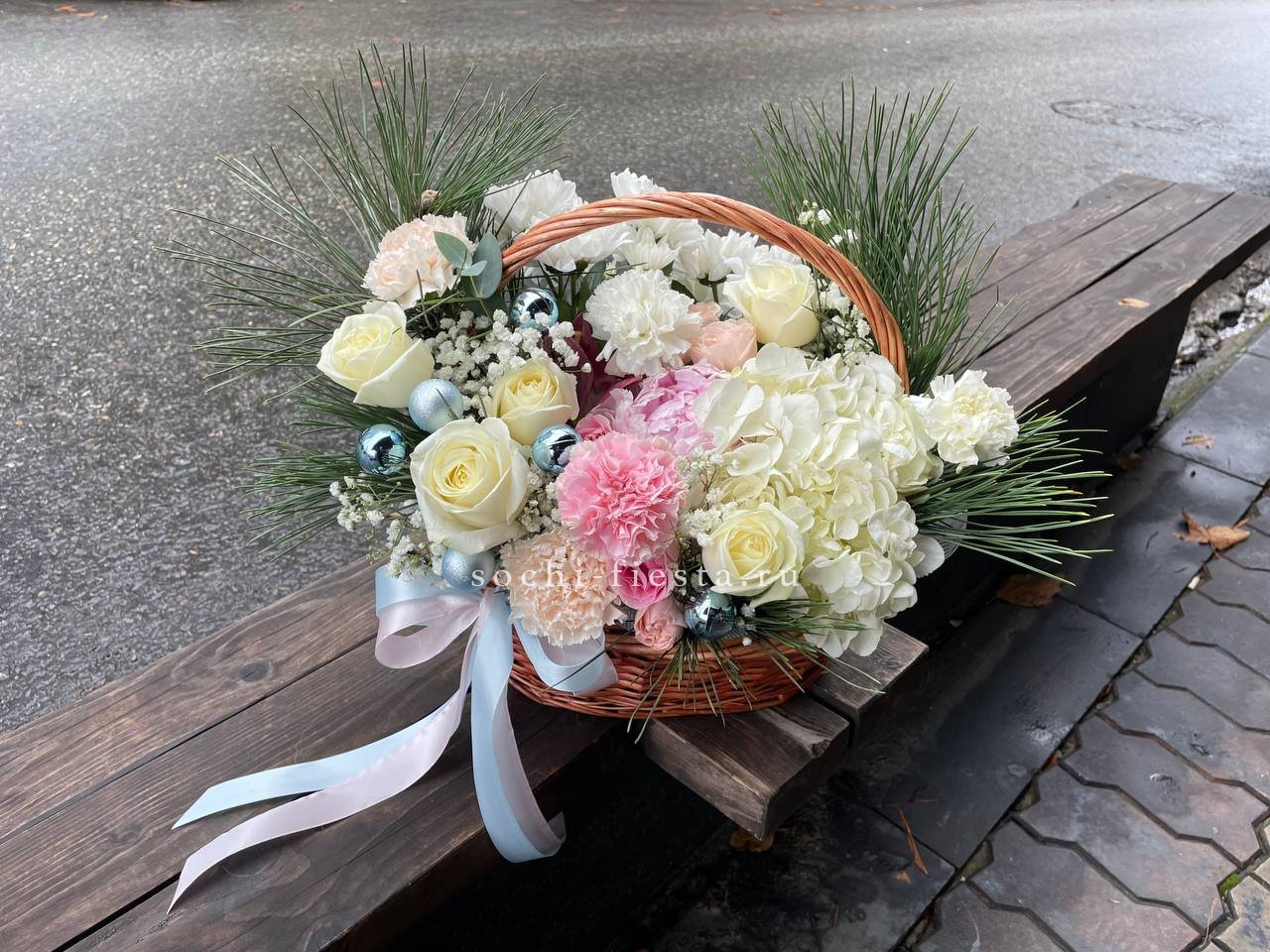 гортензия, роза, игрушки, хризантемы, диантусы, гипсофила, ель, бомбастик, корзина, оазис, лента.