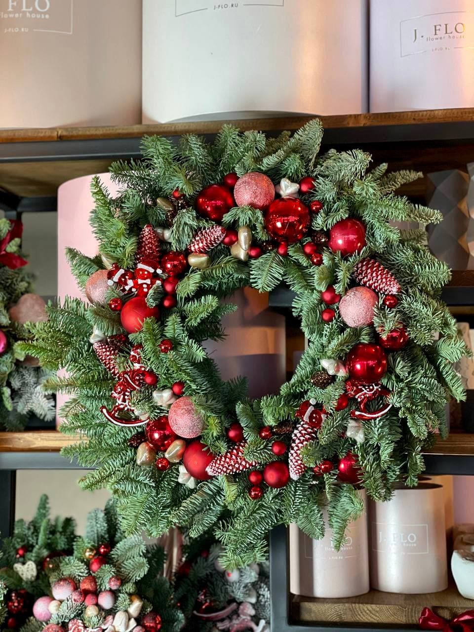 Крупный венок из датского нобилиса с насыщенной хвоей и праздничным декором. Игрушки распределены по окружности и задают ритм всей композиции.