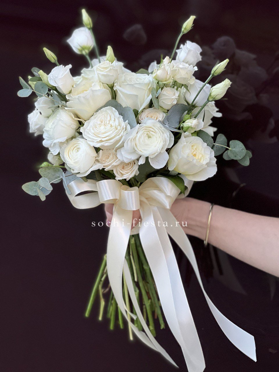 эустома, белые одноголовые розы, пионовидные кустовые кремовые розы Бомбастик, эвкалипт, лента, дизайнерская пленка комбинированная.