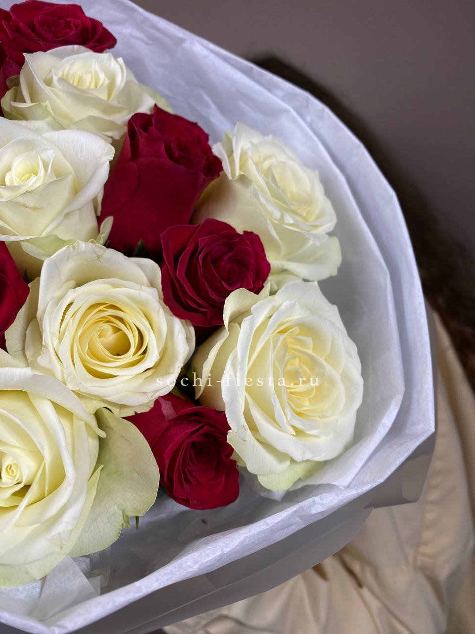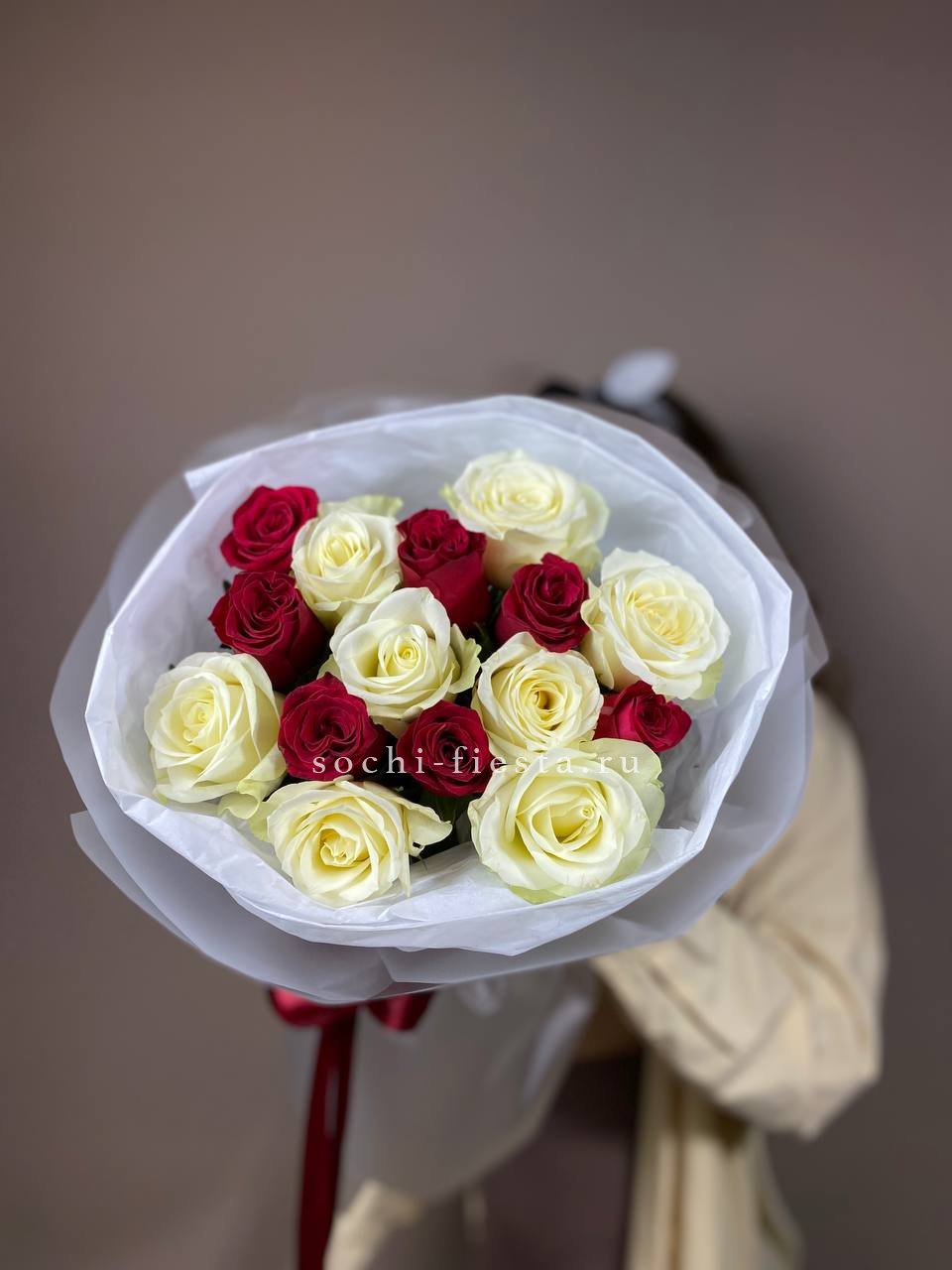 В составе 15 красно-белых роз.