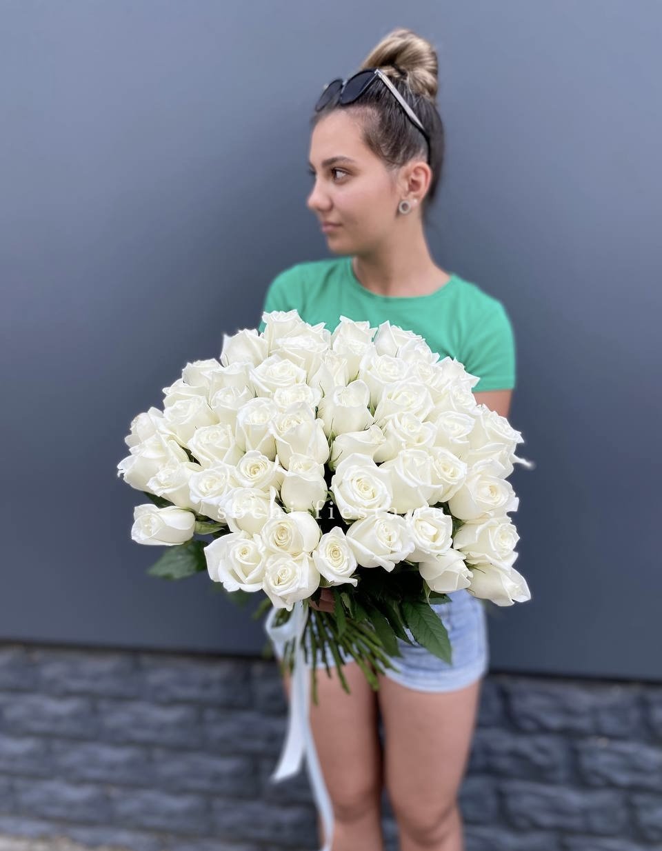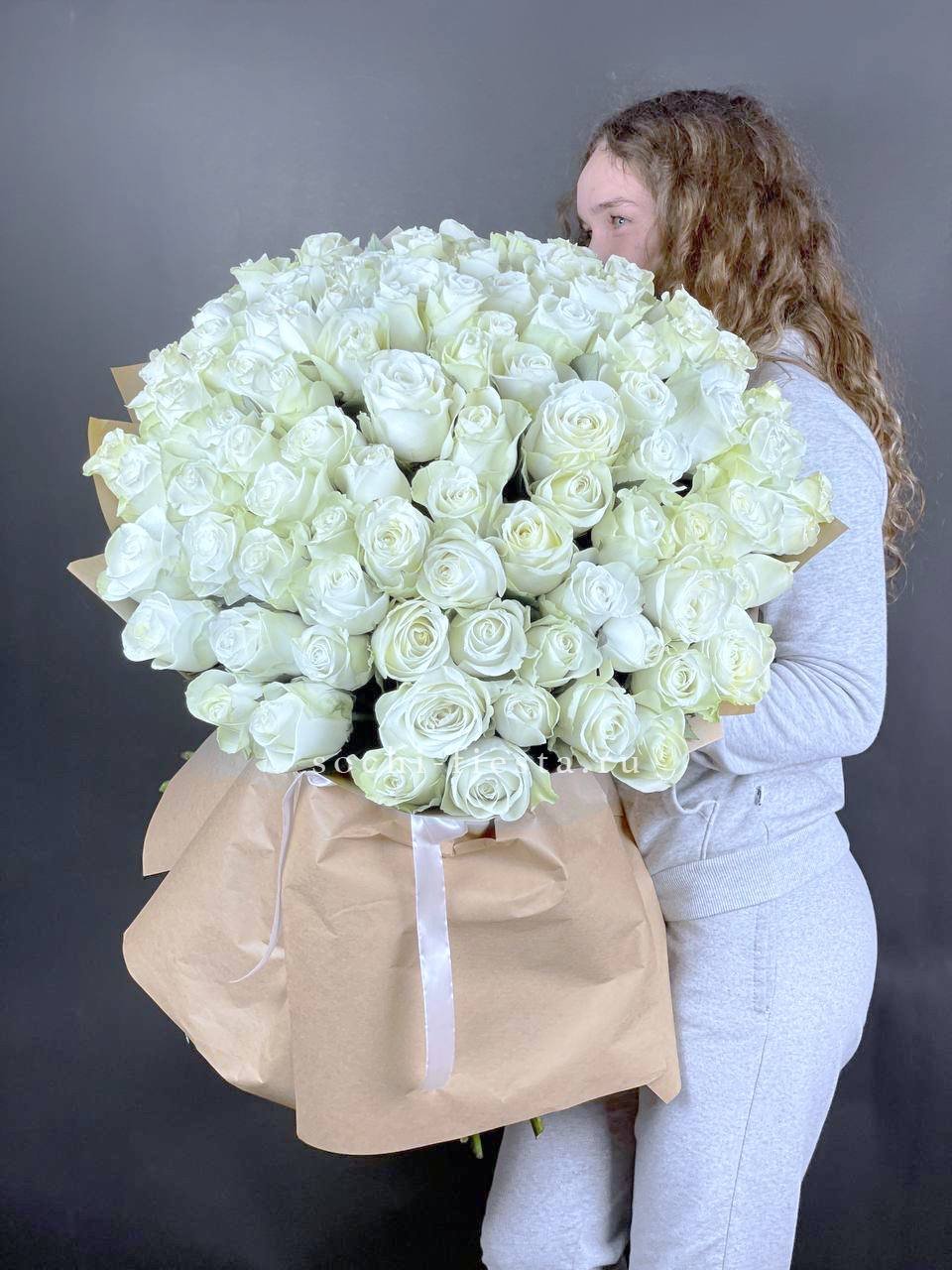 Тридцать пять белых бутонов образуют плотный монохромный ансамбль. Классическая форма и чистота оттенка позволяют букету звучать самодостаточно в любом интерьере.