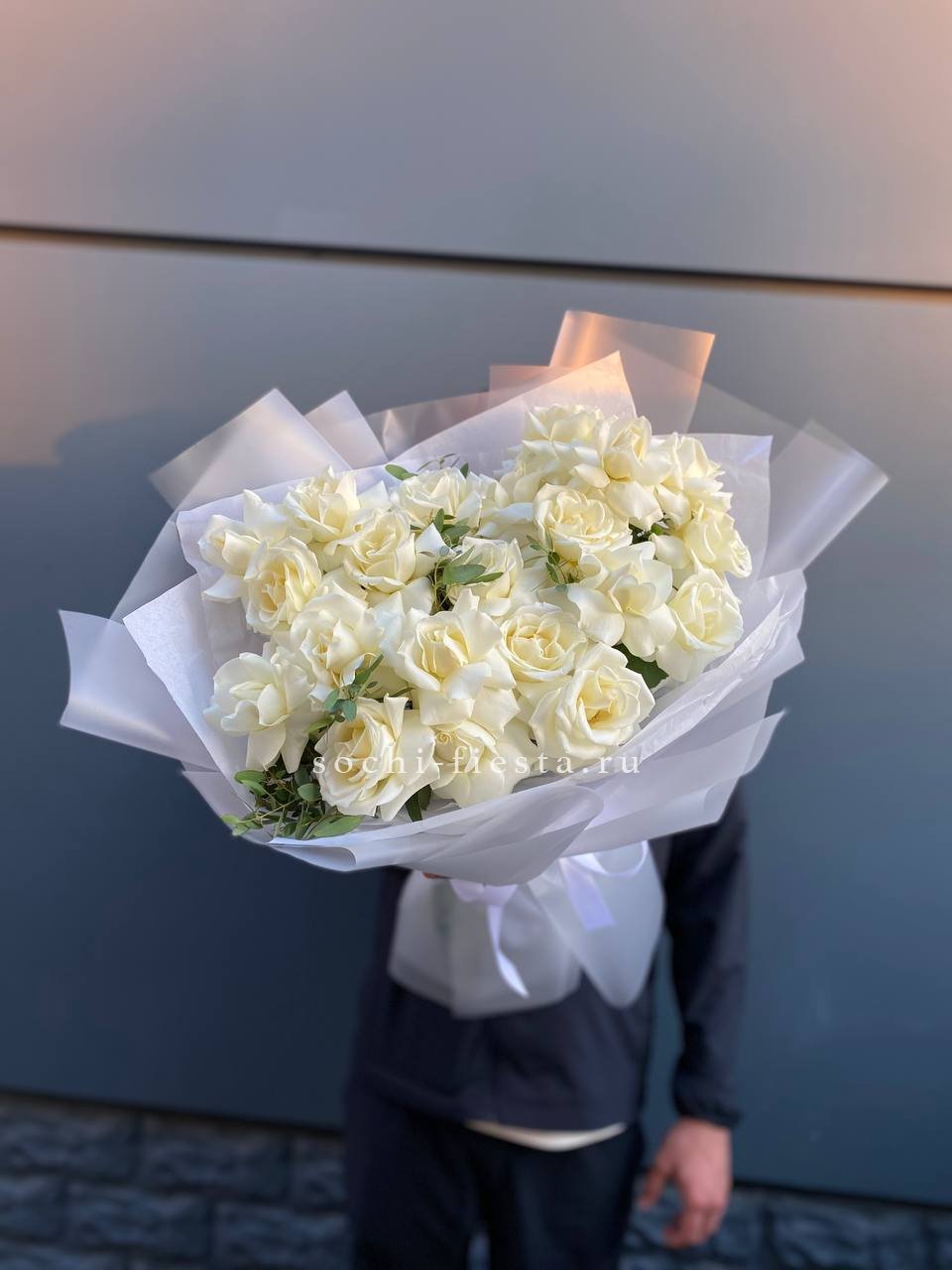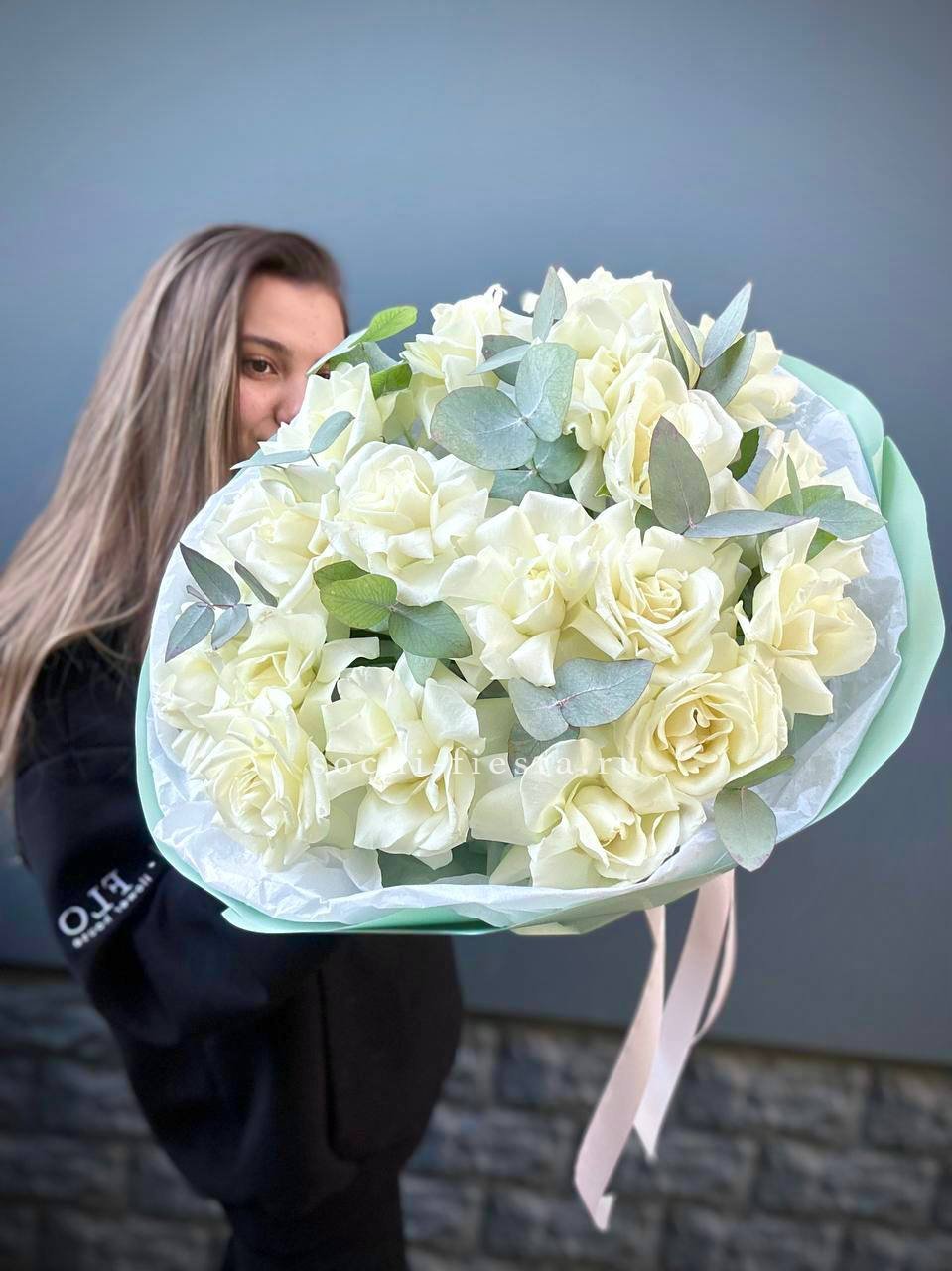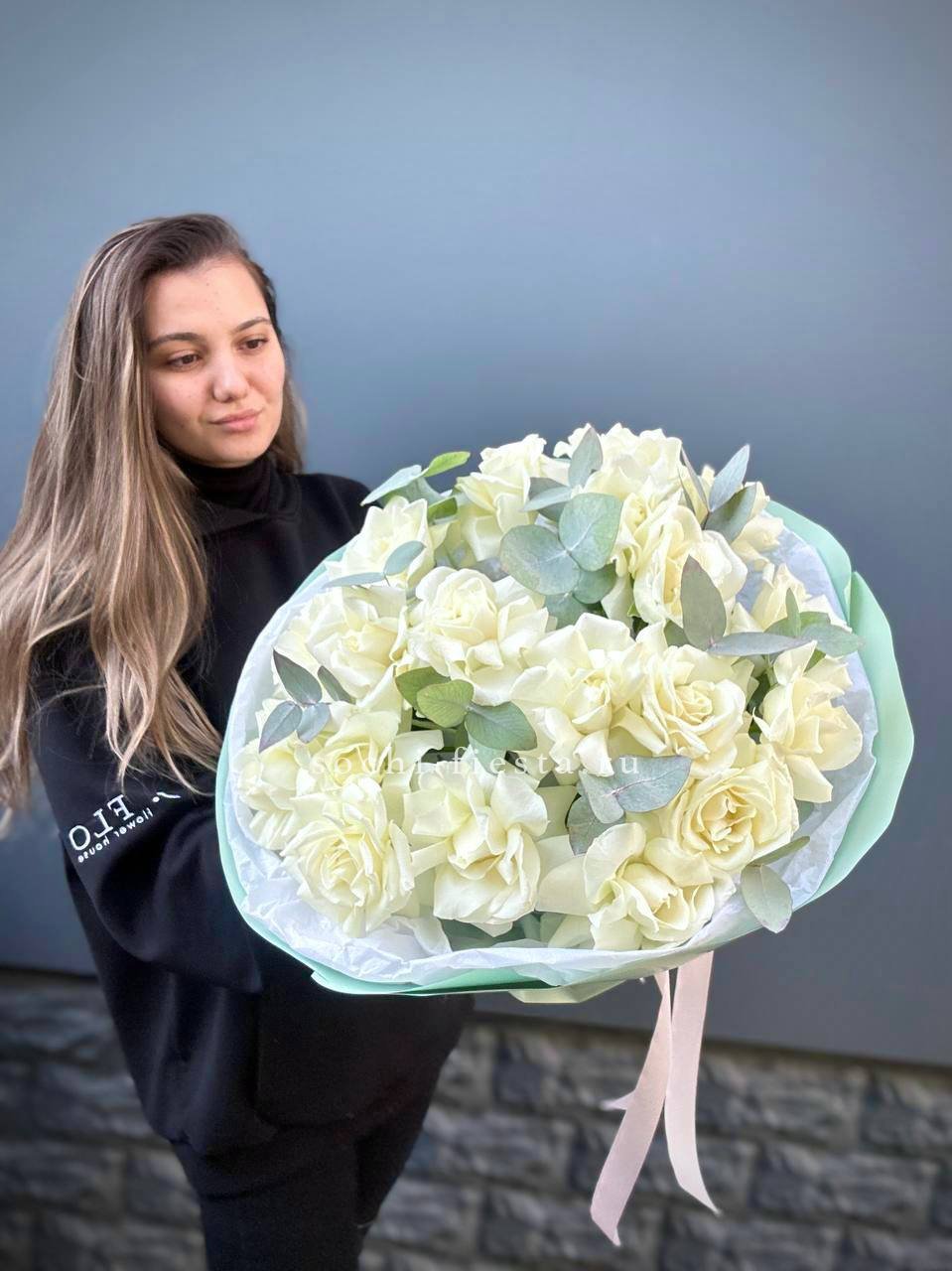 Пятьдесят один бутон выстраиваются в объёмную сферу с чёткой геометрией. Белые розы держат форму и создают ощутимое визуальное присутствие. Букет занимает пространство уверенно и спокойно.