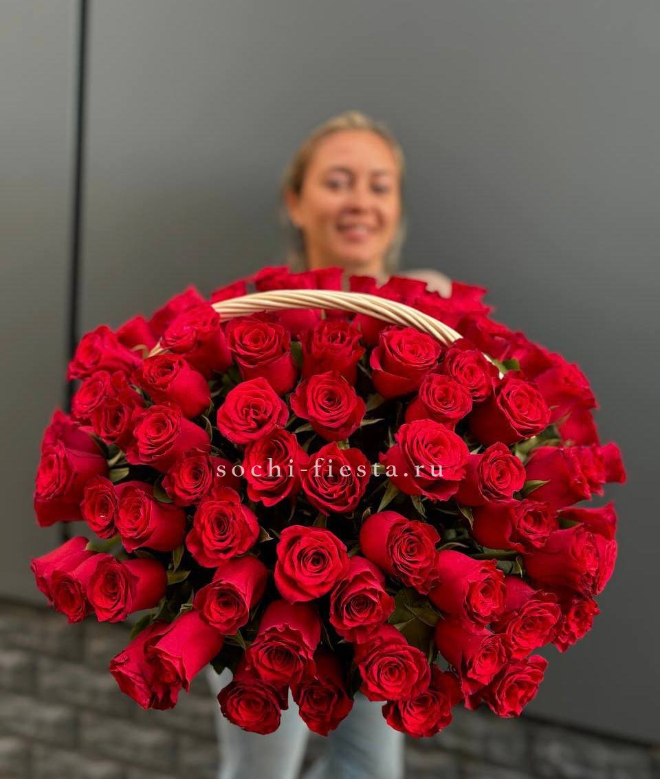 Сто одна роза насыщенного алого оттенка собрана в плетеной корзине. Плотная округлая форма создает впечатление цветочного купола. Практичное решение для масштабного жеста.