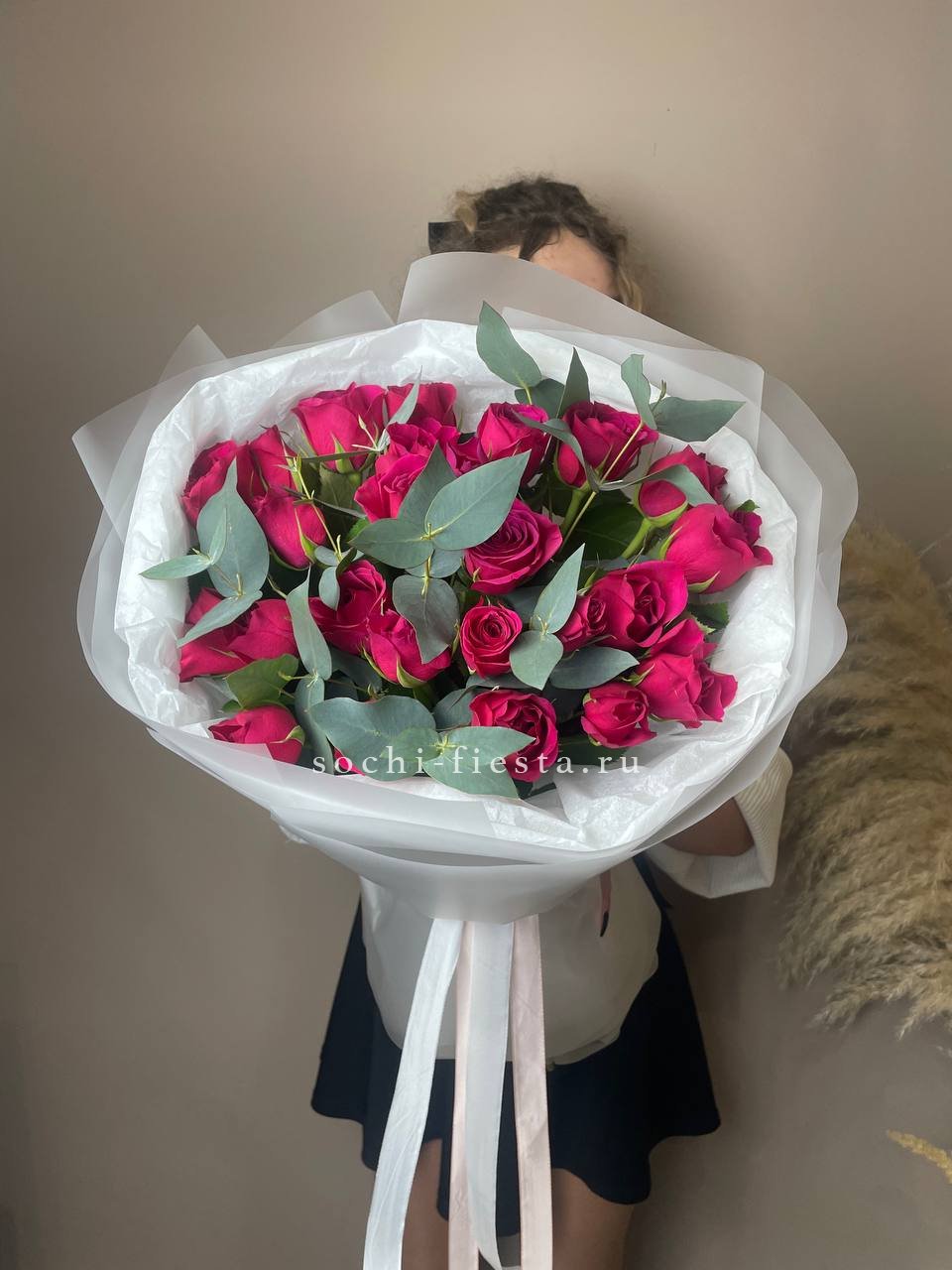 25 малиновых роз, эвкалипт, лента, дизайнерская пленка.