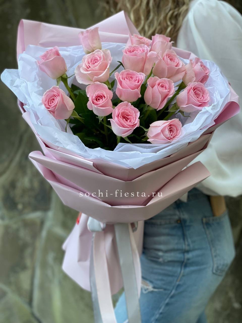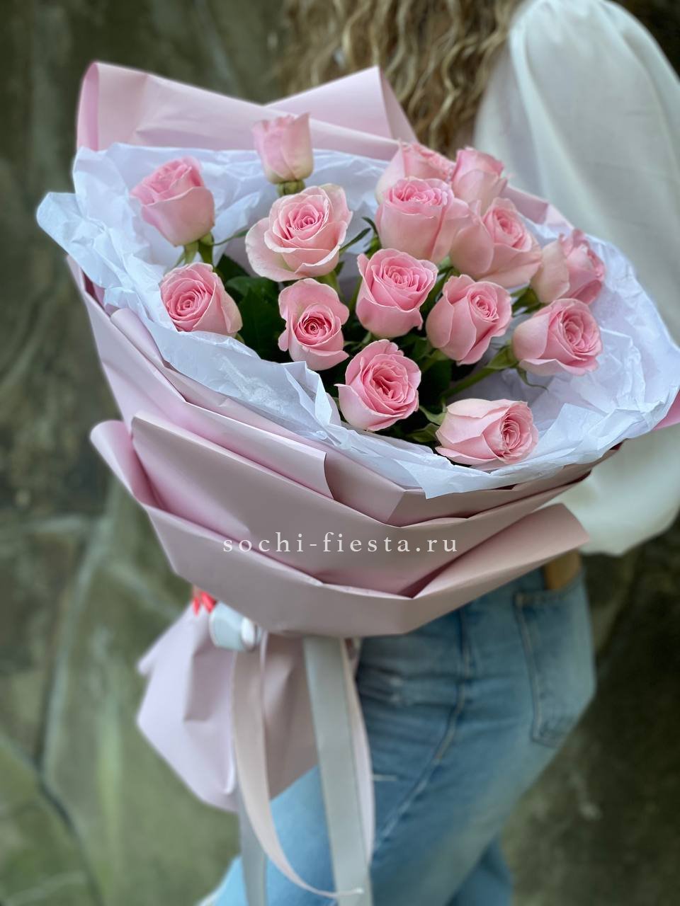 Тридцать одна роза образует пышное облако розового цвета с серебристыми нотами эвкалипта. Крафтовая обертка подчёркивает естественную красоту бутонов и создаёт ощущение лёгкости.