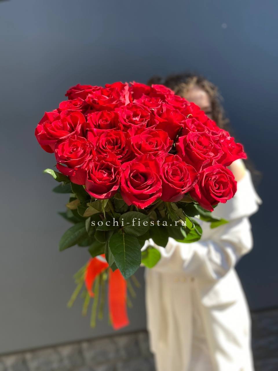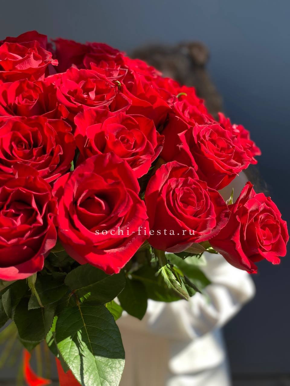 Девятнадцать красных роз с ажурной фактурой лепестков раскрываются постепенно, обнажая глубину каждого бутона. Фоамиран добавляет мягкости силуэту и завершает форму.