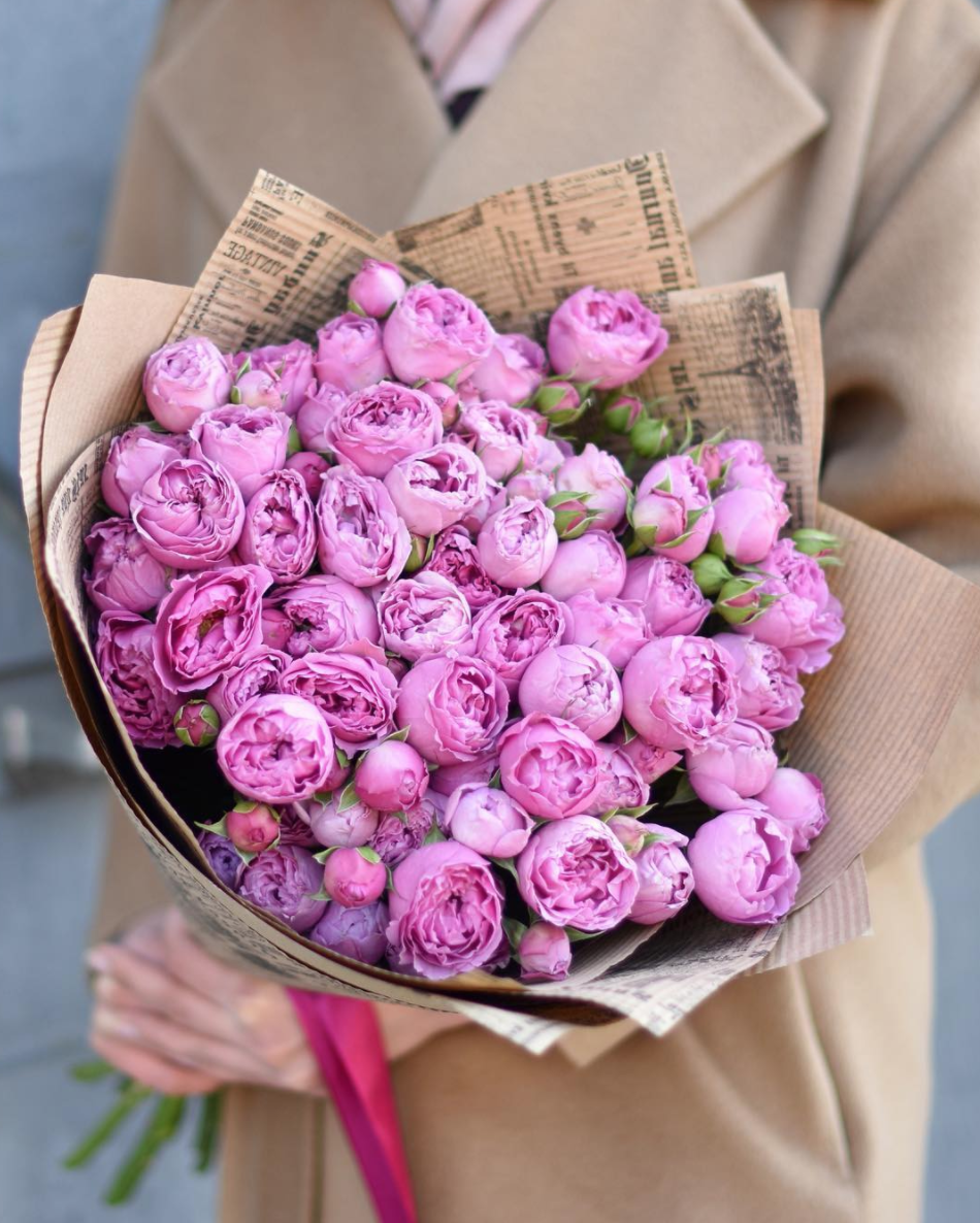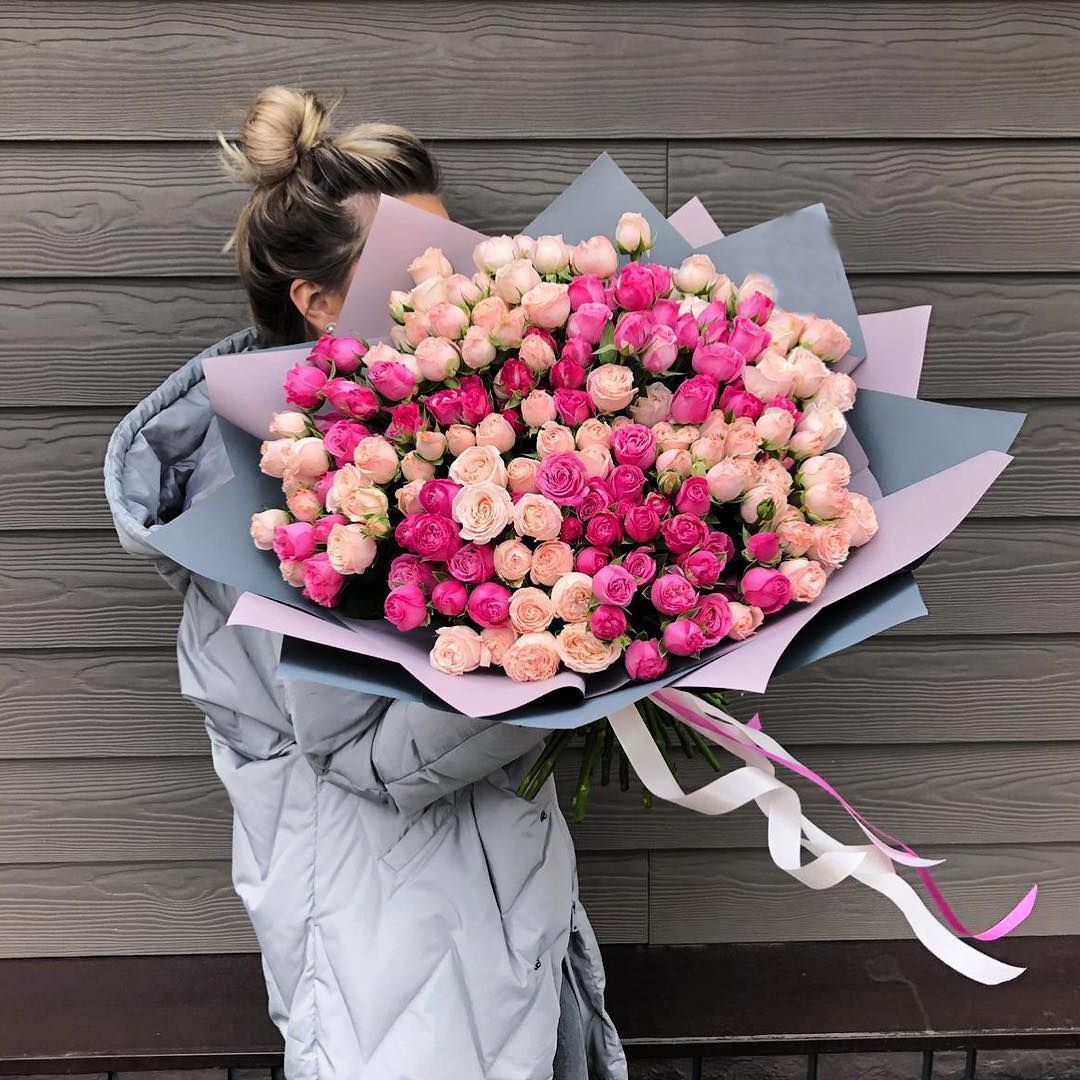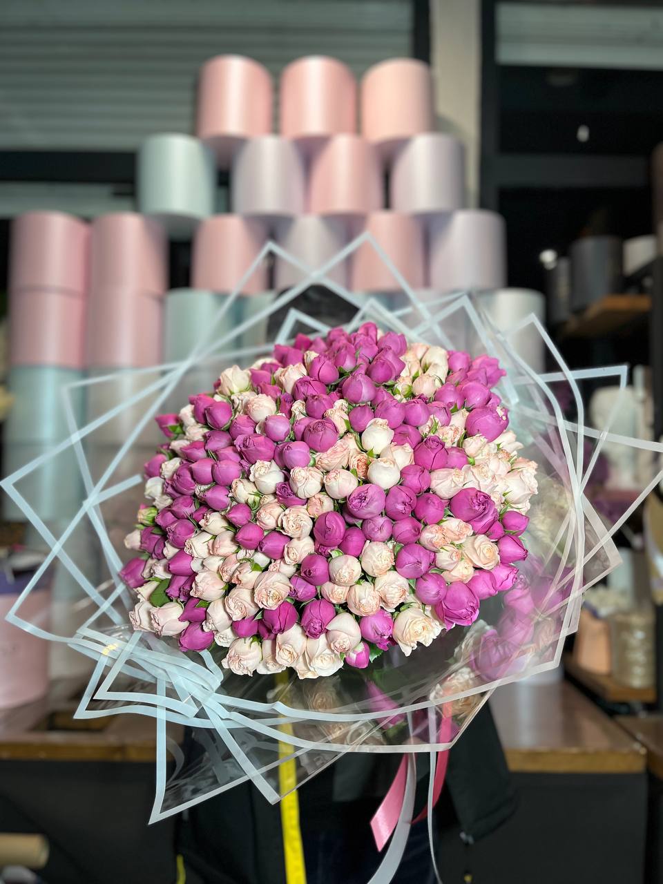 55 роз сорта Misty bubbles и bombastic, лента, дизайнерская упаковка.