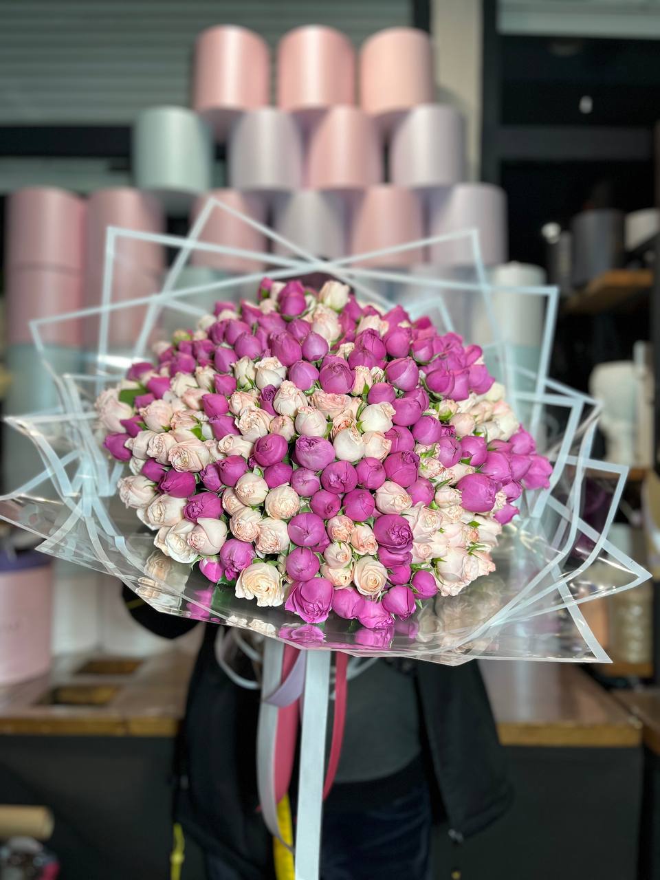 Пятьдесят пять роз двух сортов образуют монументальную композицию с выраженным присутствием в пространстве. Крупные бутоны создают плотную текстуру и заполняют объём без пустот. Впечатление масштаба и продуманной гармонии.