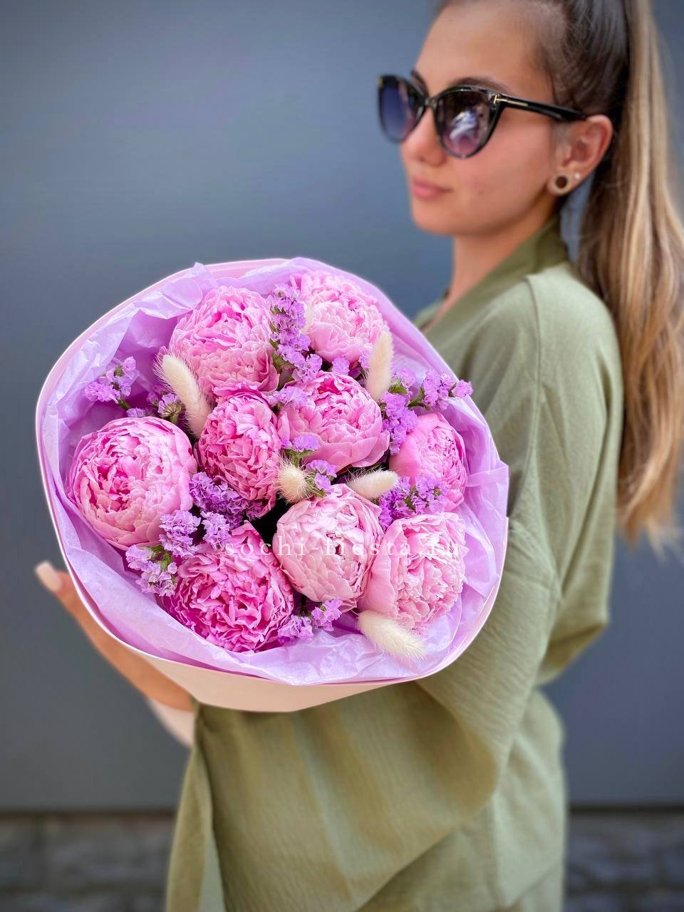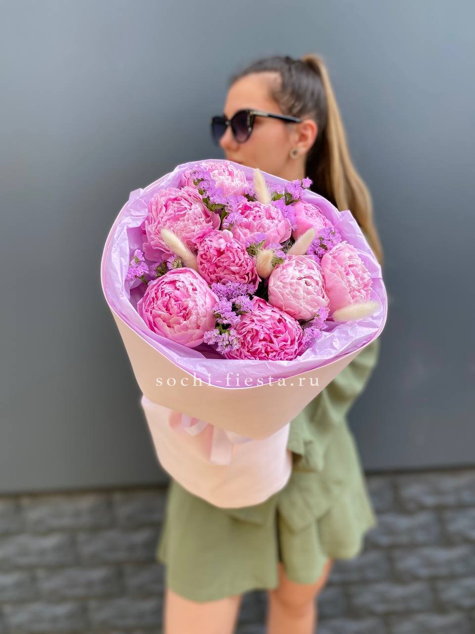 Крупные бутоны пионов окружены воздушными метёлками лагуруса и мелкими соцветиями статицы. Композиция собрана с акцентом на естественную лёгкость и свободное движение линий.
