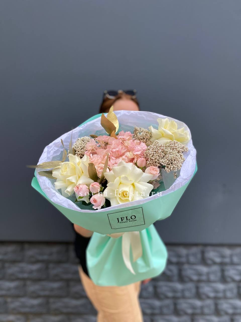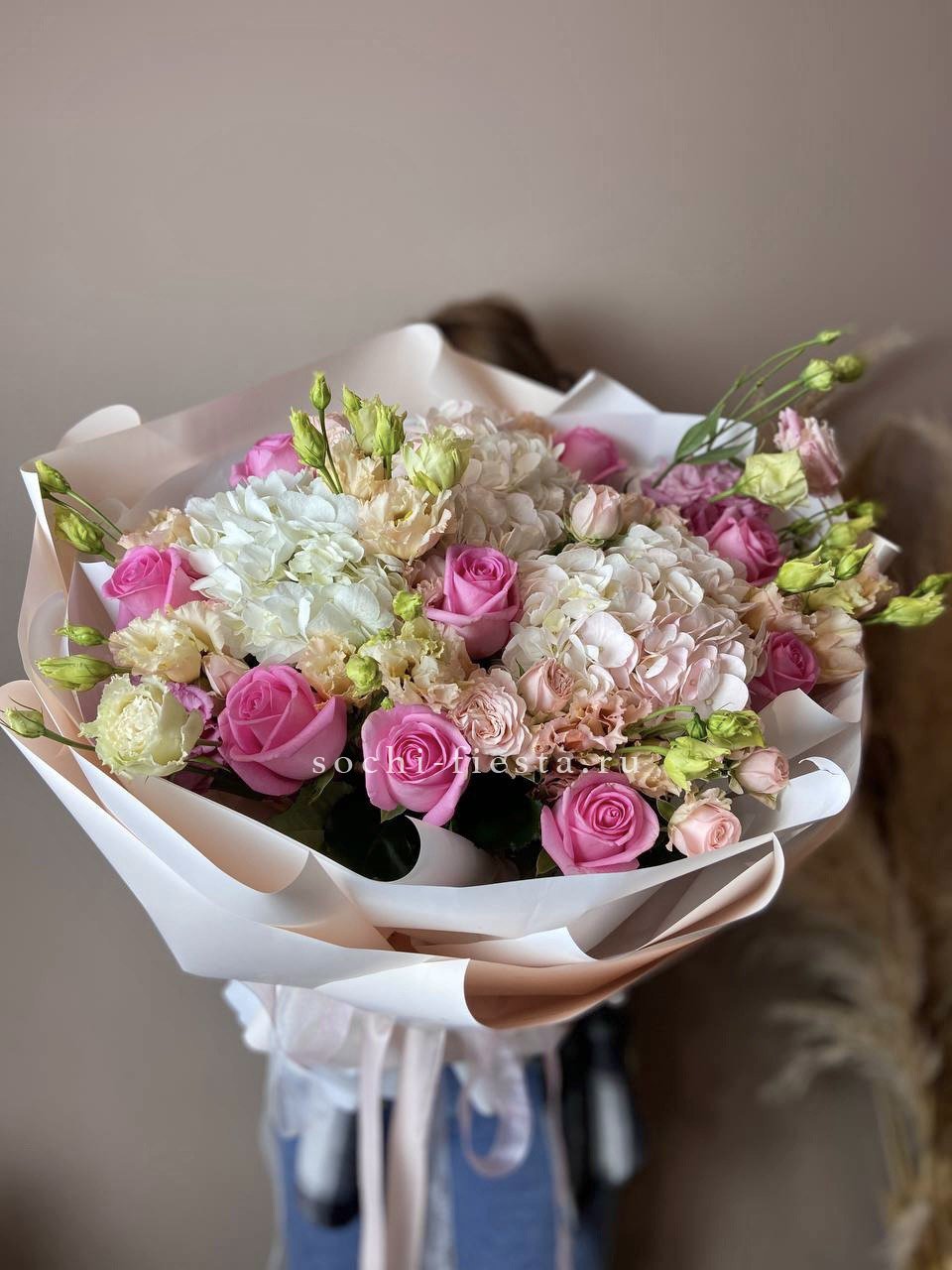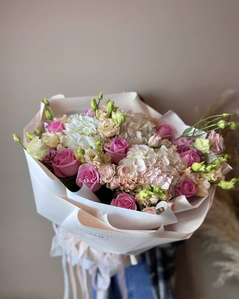 Белые розы и шары гортензии заполняют пространство плотно, но без тяжести. Озатамус вносит лёгкую текстуру, а эвкалипт завершает силуэт спокойной зеленью.