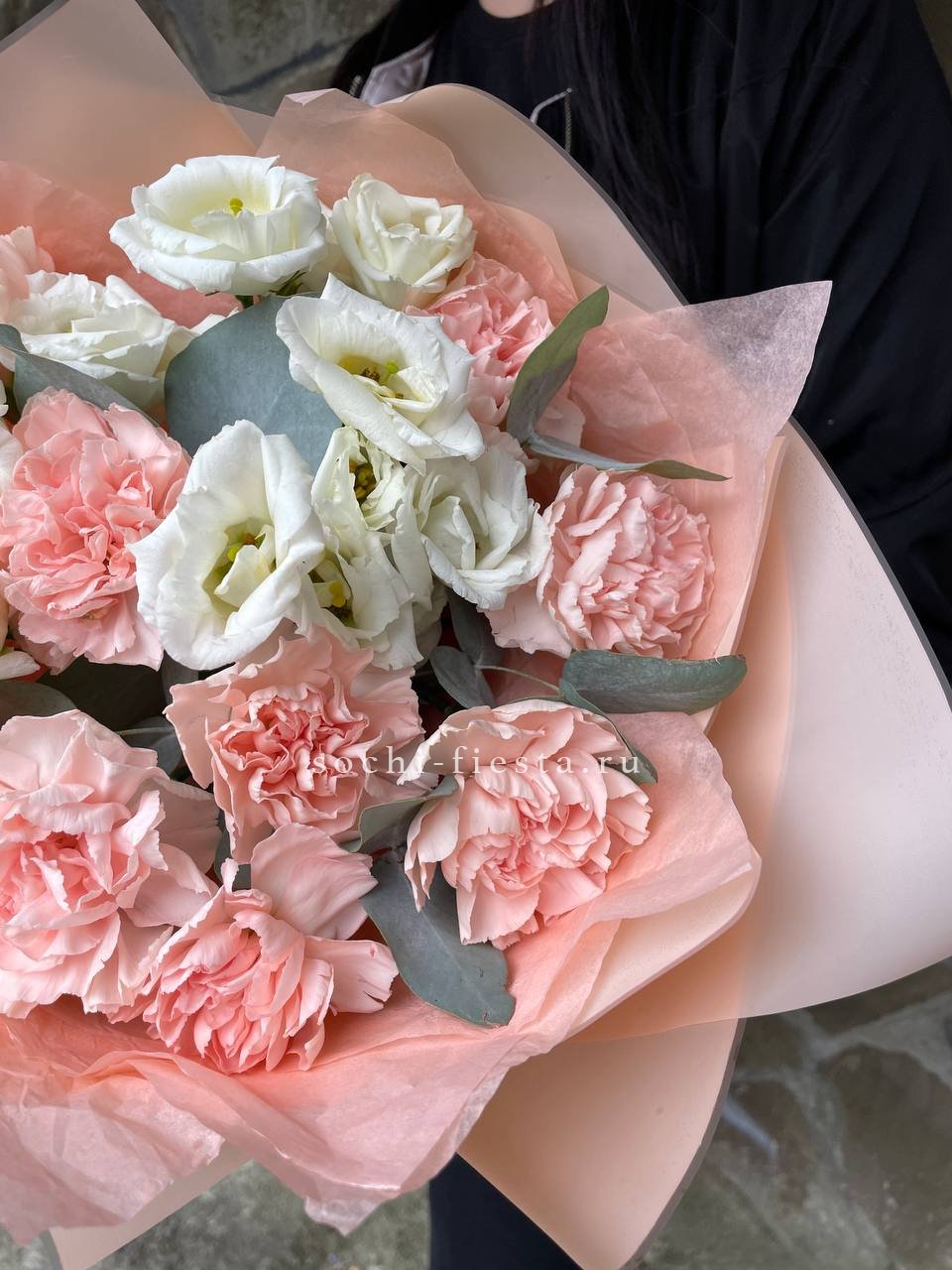 Пастельная гамма с лёгким касанием зимнего воздуха. Кустовые розы и диантус окружены воздушным ковылём, создавая мягкую текстуру с едва уловимой графикой. Гортензия добавляет объём, не перегружая силуэт.