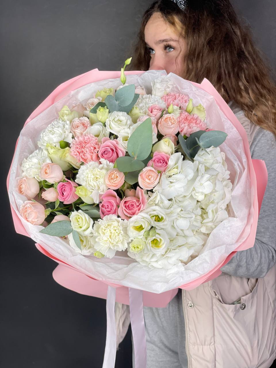 розовые розы, эустома, лента, упаковка.