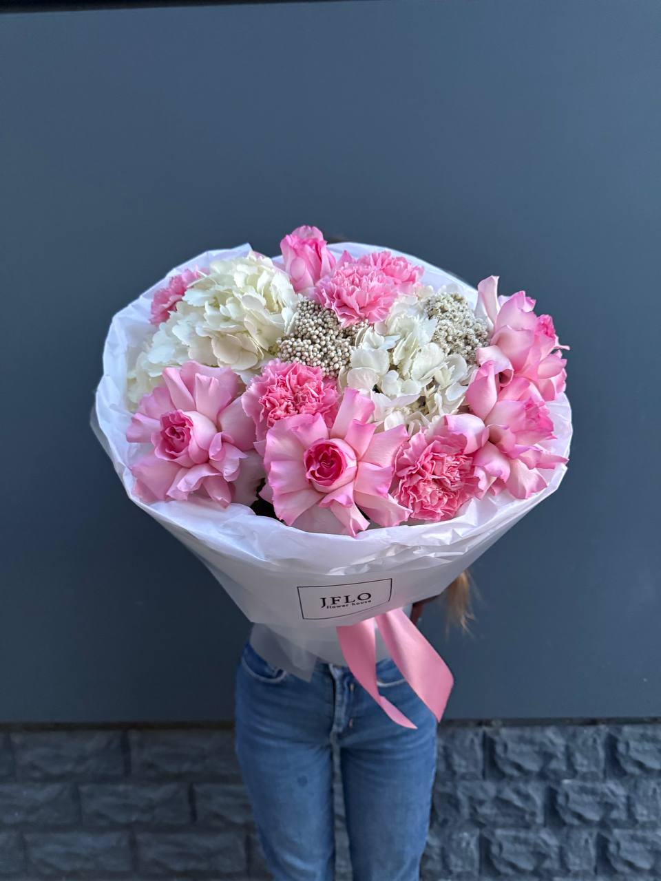 Плотная сборка с пышными соцветиями гортензии и яркими герберами создает объемный силуэт. Маттиола и лимониум добавляют воздушности по краям, а диантусы заполняют центр мягкими переходами.