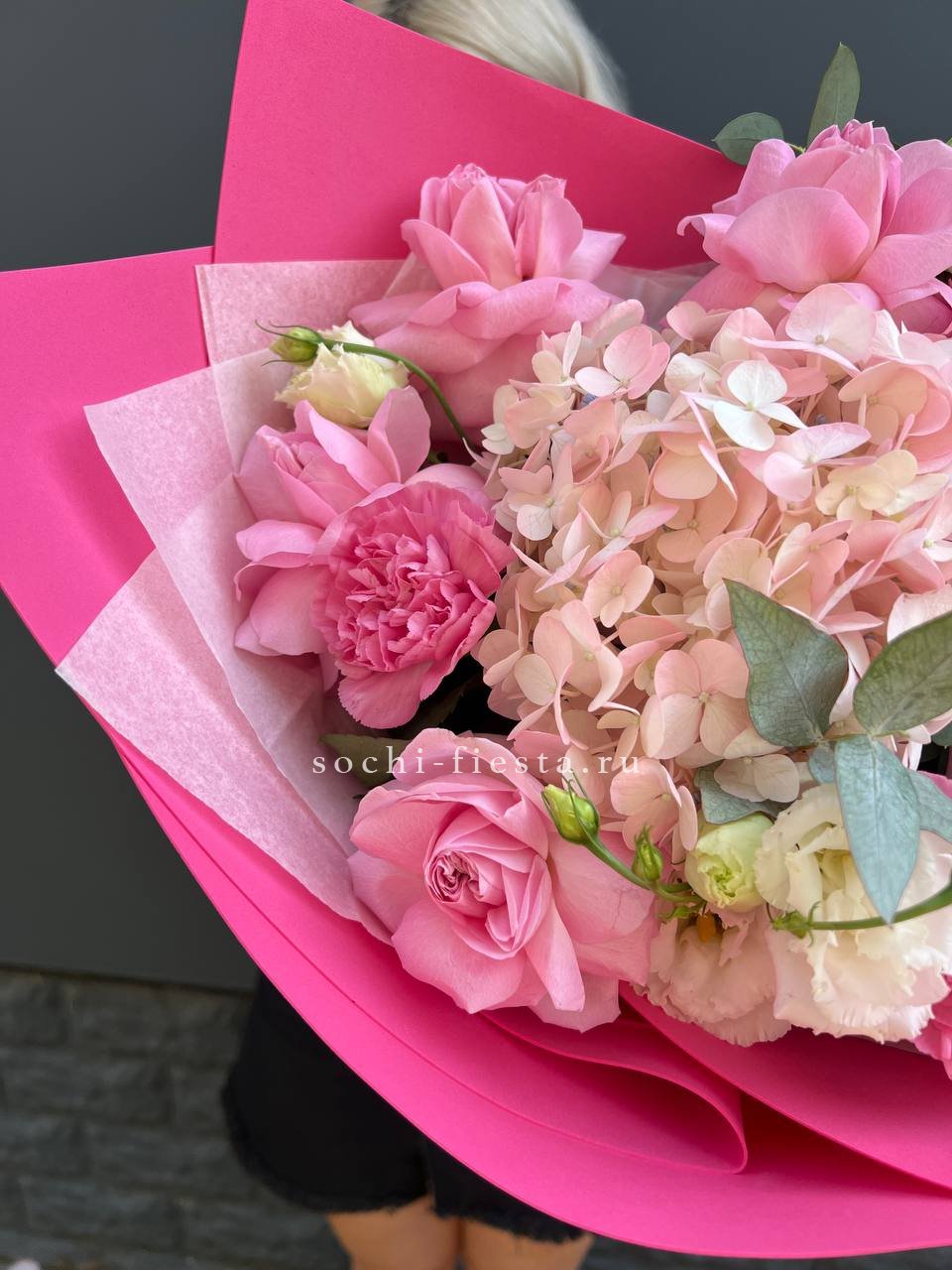 французские розы, маттиола, гортензии, эвкалипт, стифа, упаковка, лента.