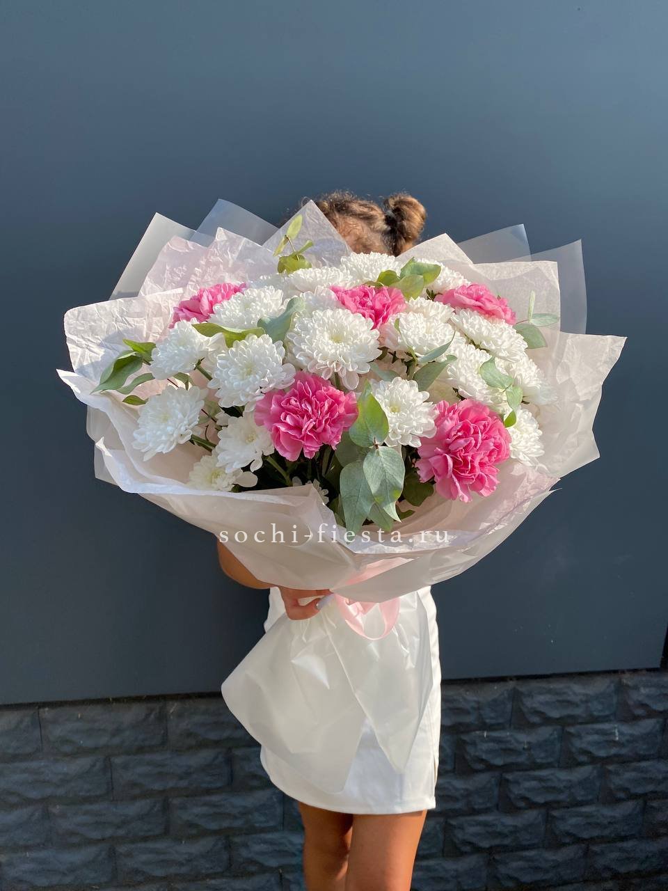 хризантема кустовая, диантусы, эвкалипт, оформление.