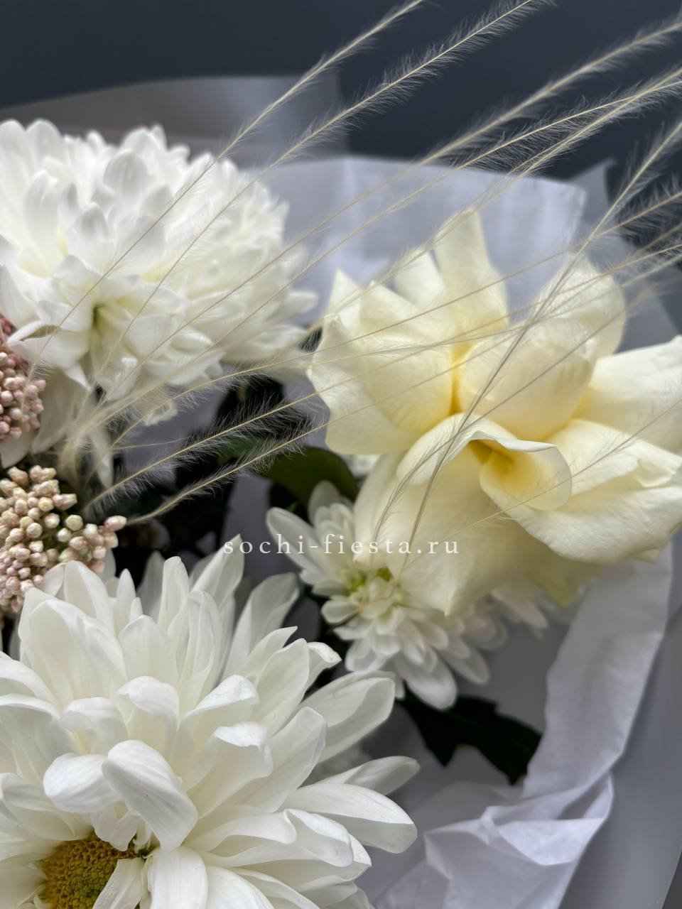 Воздушная композиция собирает кустовую хризантему, эустому и диантус в единый ритм. Озотамус и эвкалипт задают структуру, сохраняя свежесть надолго.