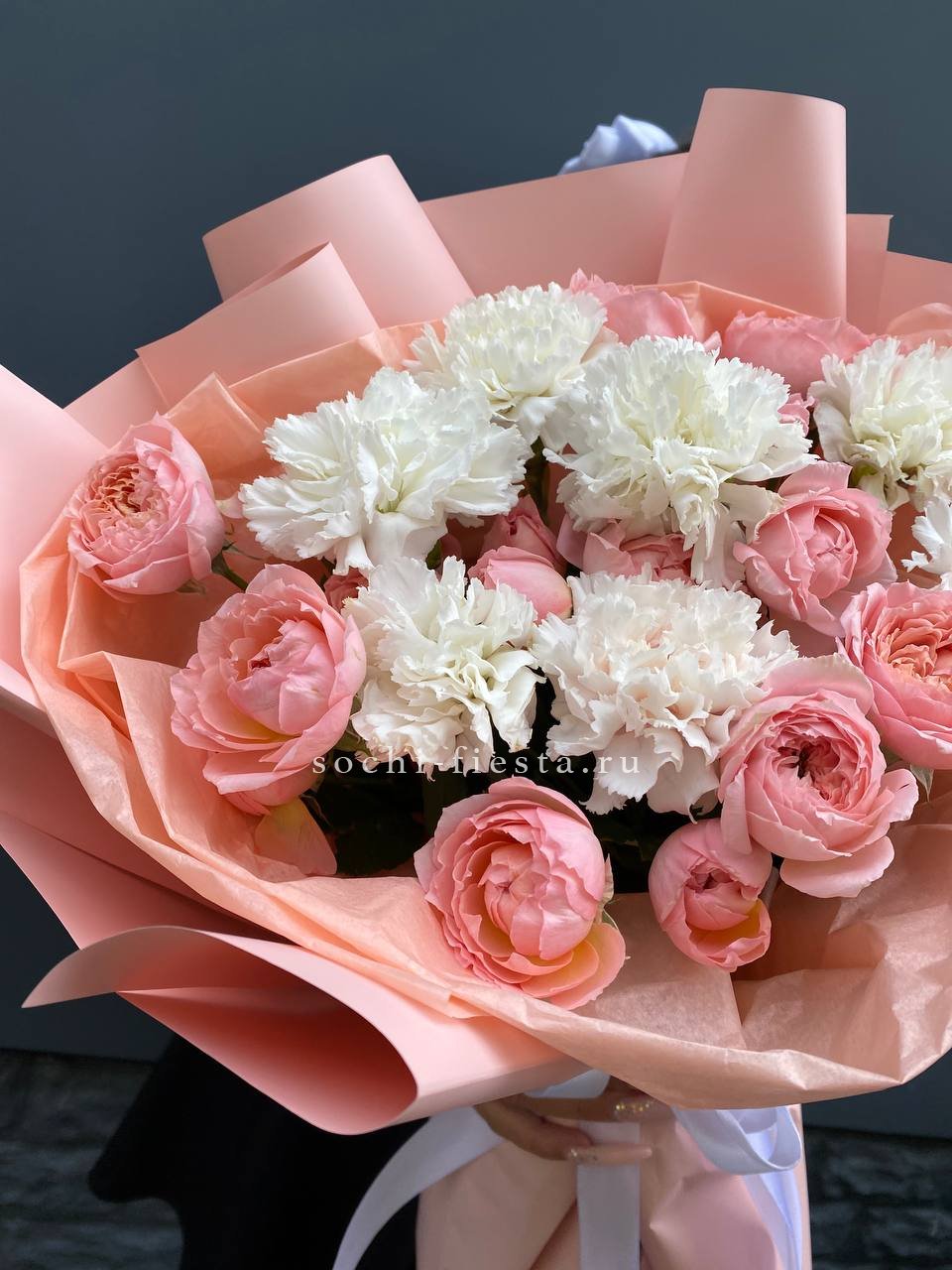 кустовые розы Джульетта и диантусы в нежном оформлении.
