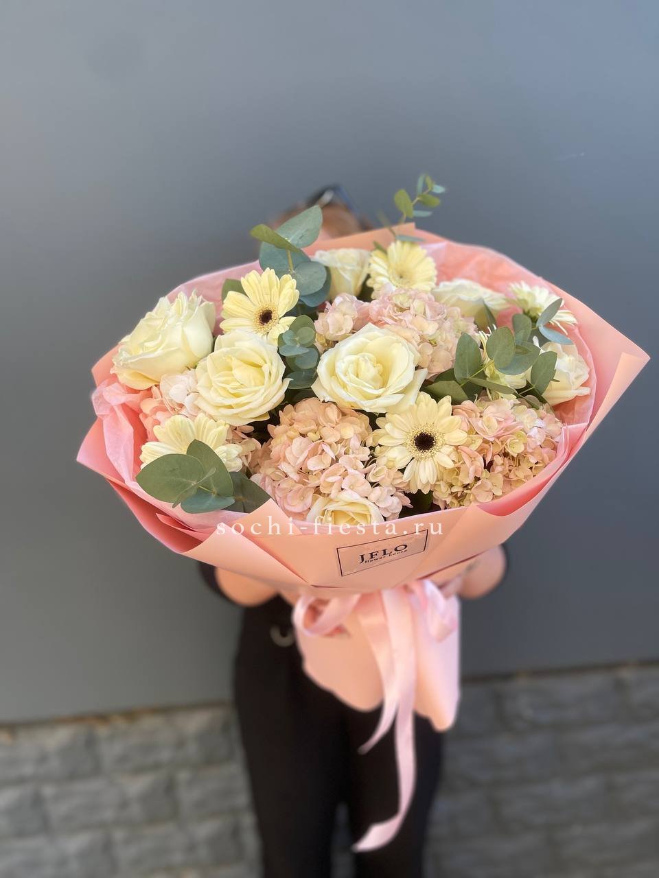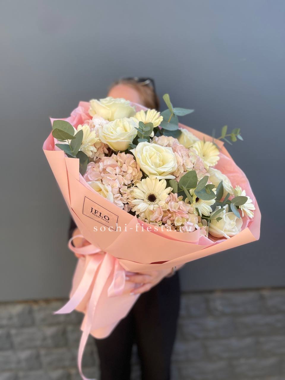 гортензия, диантус, хризантема, эустома, розы, озатамус, пленка.