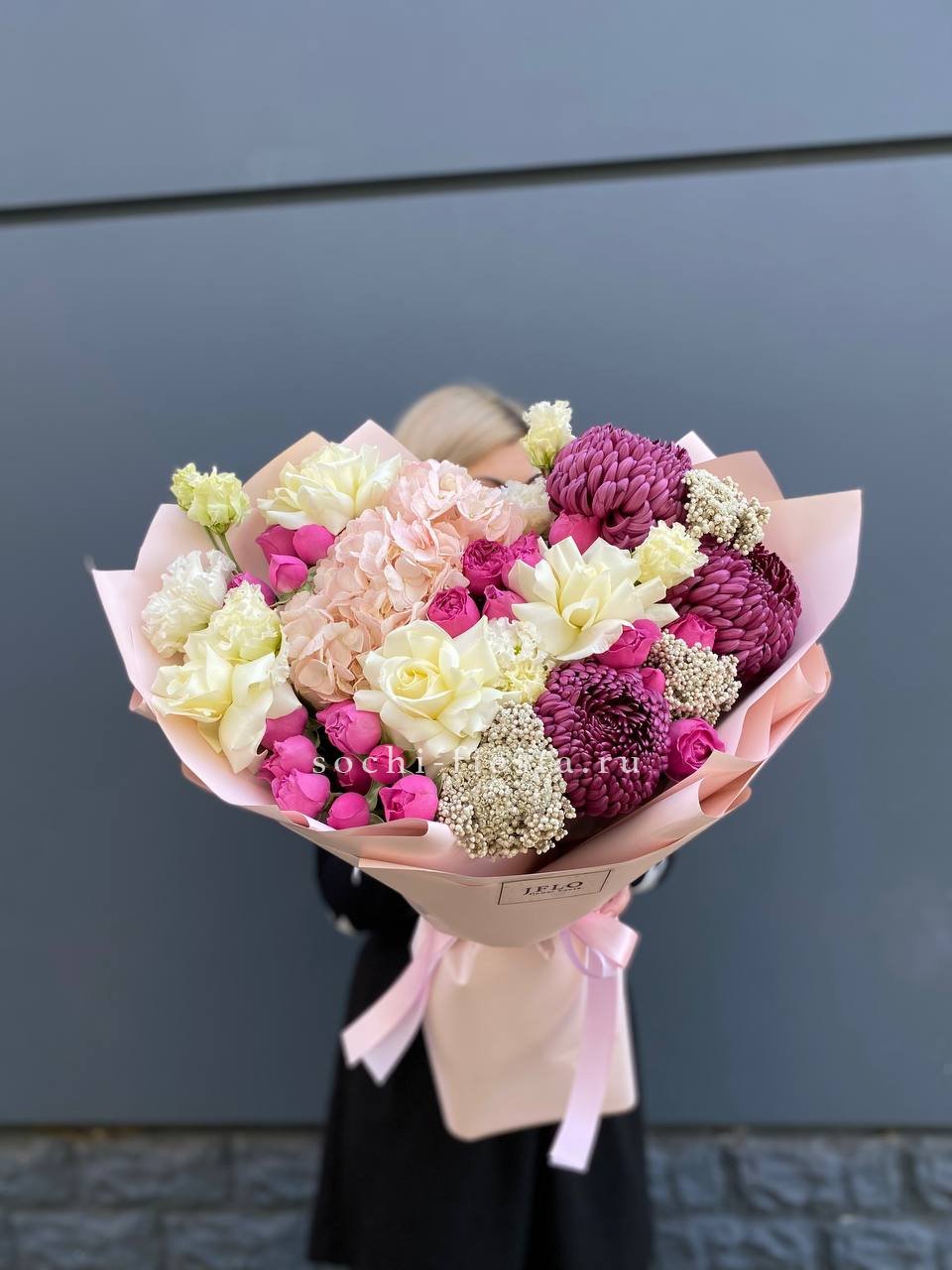 бигуди, гортензия, мисти баблс, розы, эустома, озотамус в нежном оформлении.