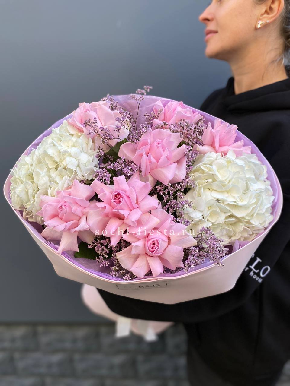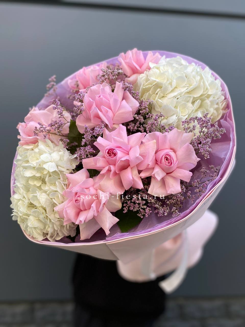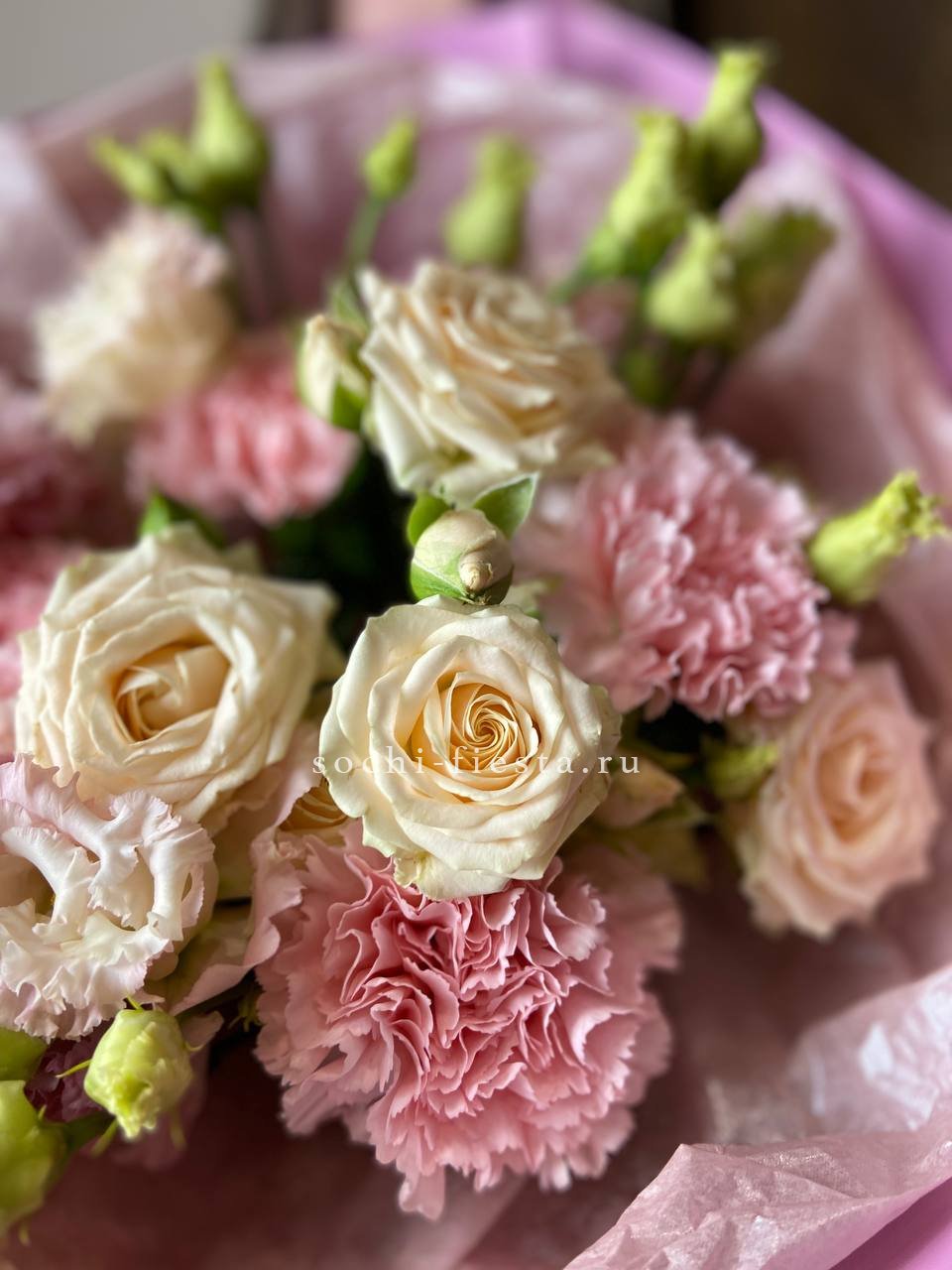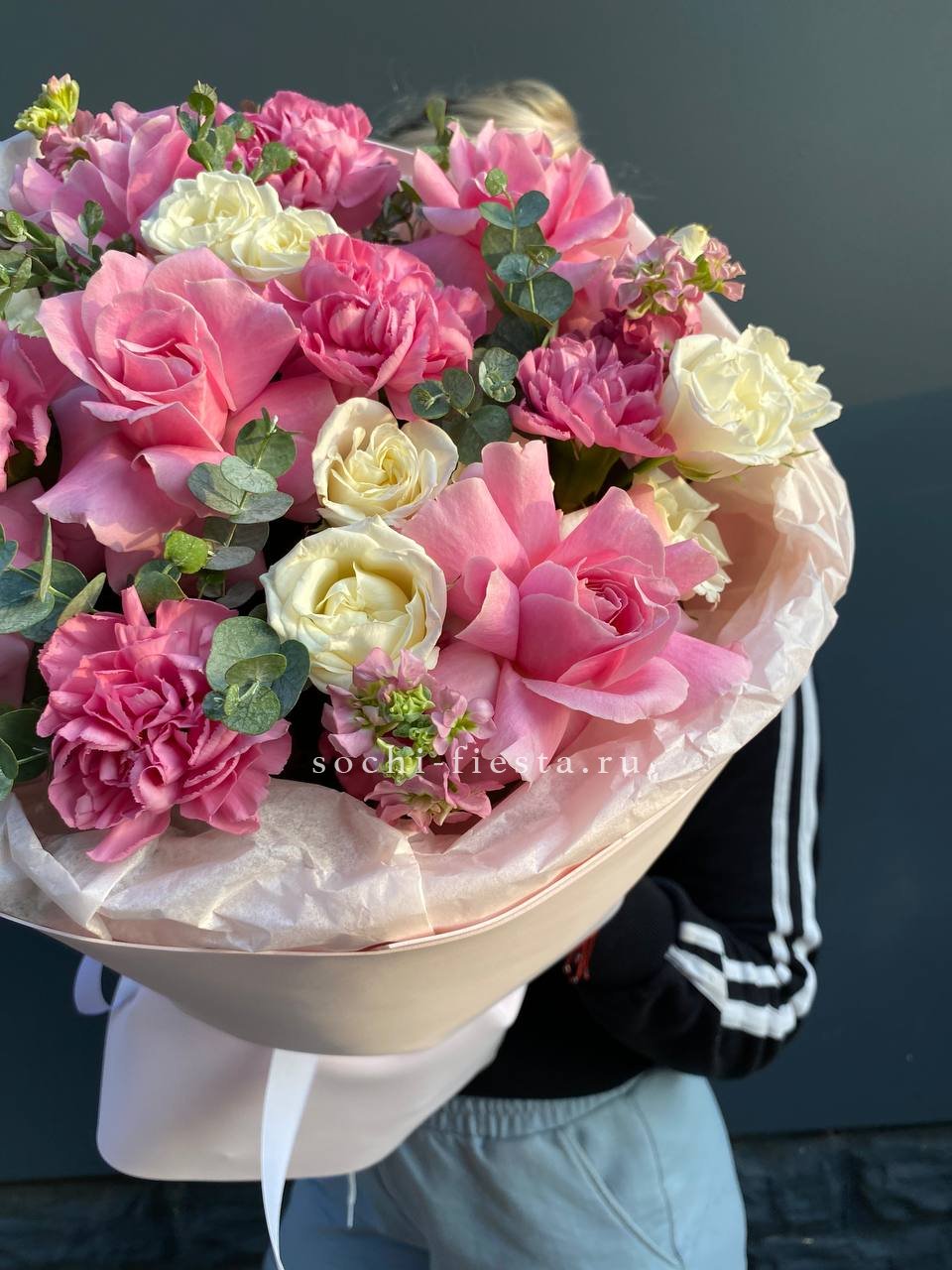Розовые розы и диантусы окружены пышными соцветиями маттиолы и бомбастика. Композиция собрана плотно, каждый цветок поддерживает соседний, создавая объемную округлую форму. Букет держит силуэт и выглядит цельно с любого ракурса.