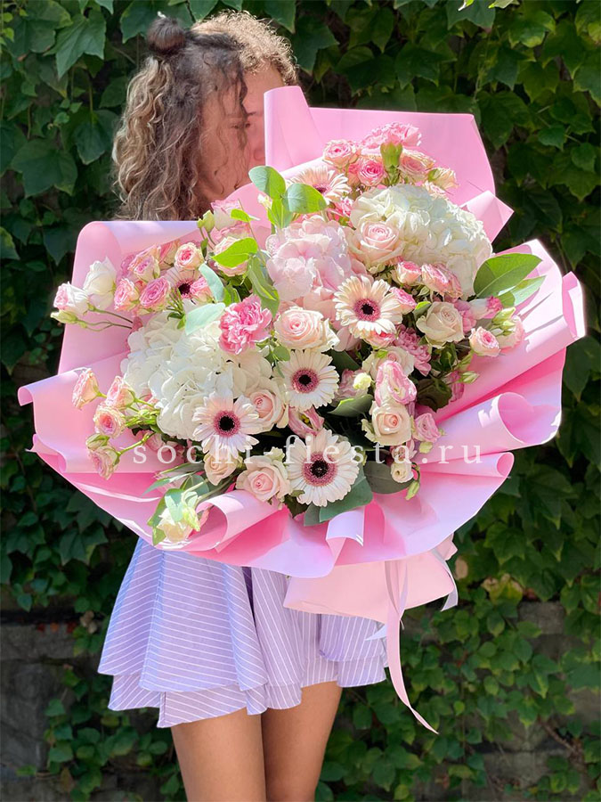 Гортензия образует пышную основу, сквозь которую проступают светлые головки эустомы и роз. Бомбастик вносит графичность, создавая объём и глубину.