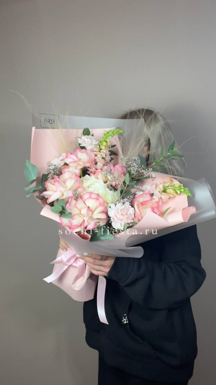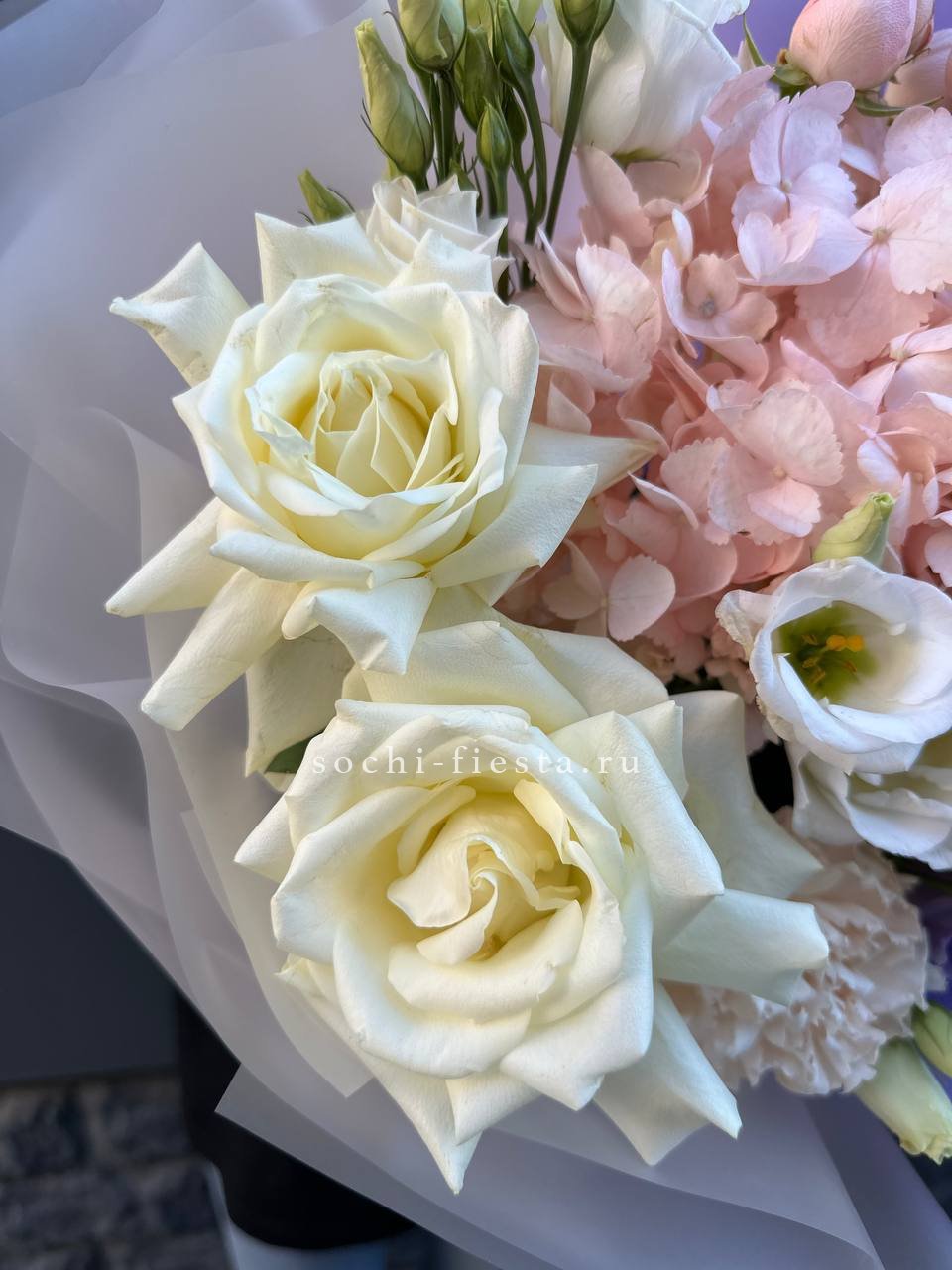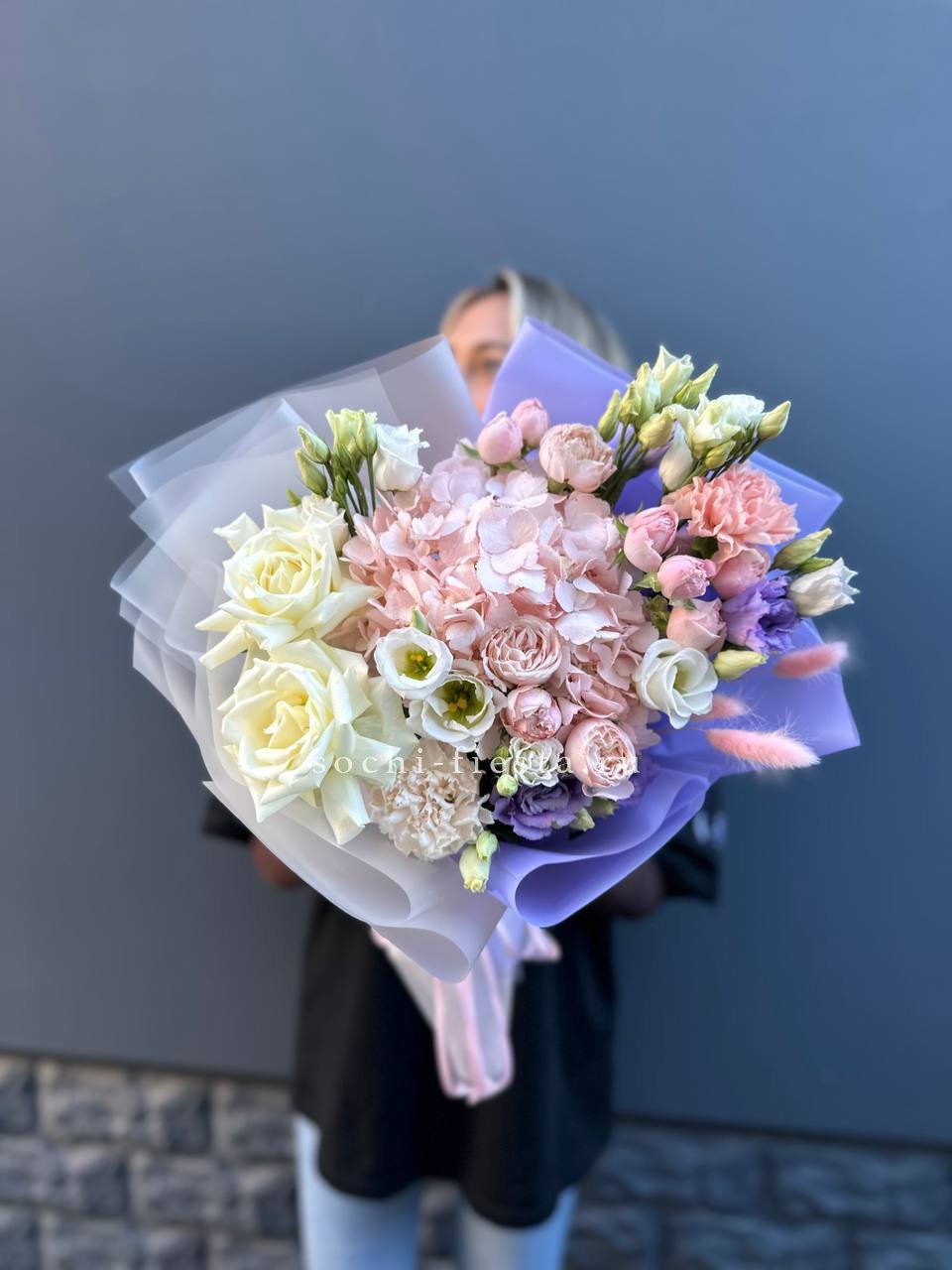 гортензия, французские розы, маттиола, лимониум, дианстусы, эвкалипт, ковыль и дизайнерская упаковка.