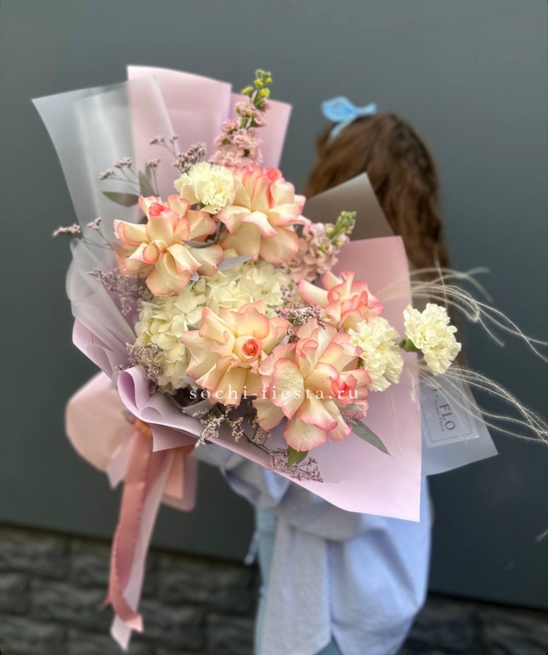 Гортензия задаёт пышную основу, а маттиола и лимониум наполняют букет текстурной глубиной. Французские розы и ковыль создают динамику, которая оживляет композицию и придаёт ей выразительность.