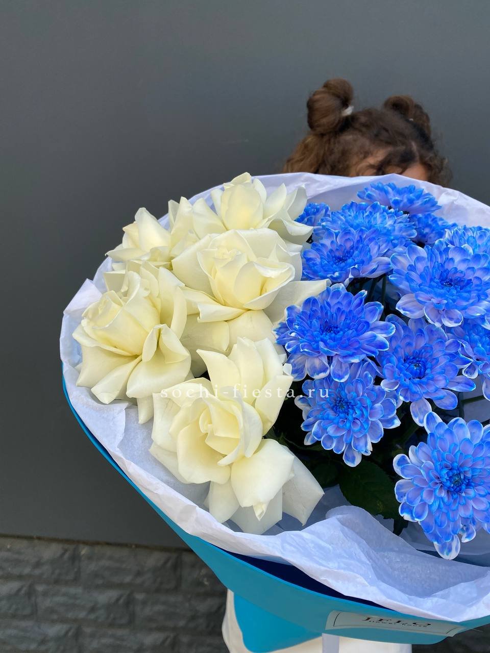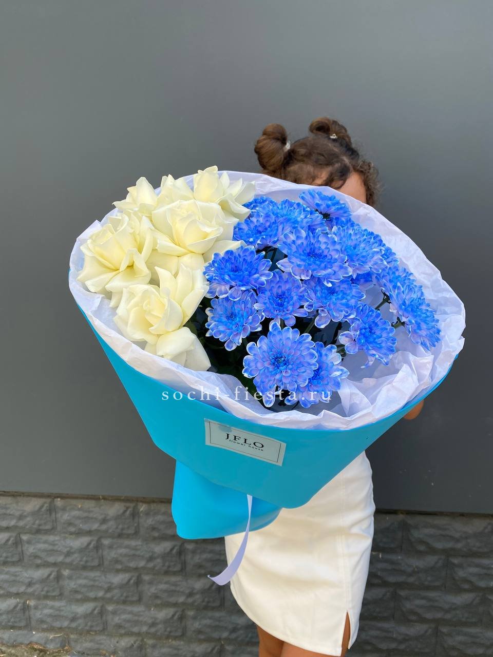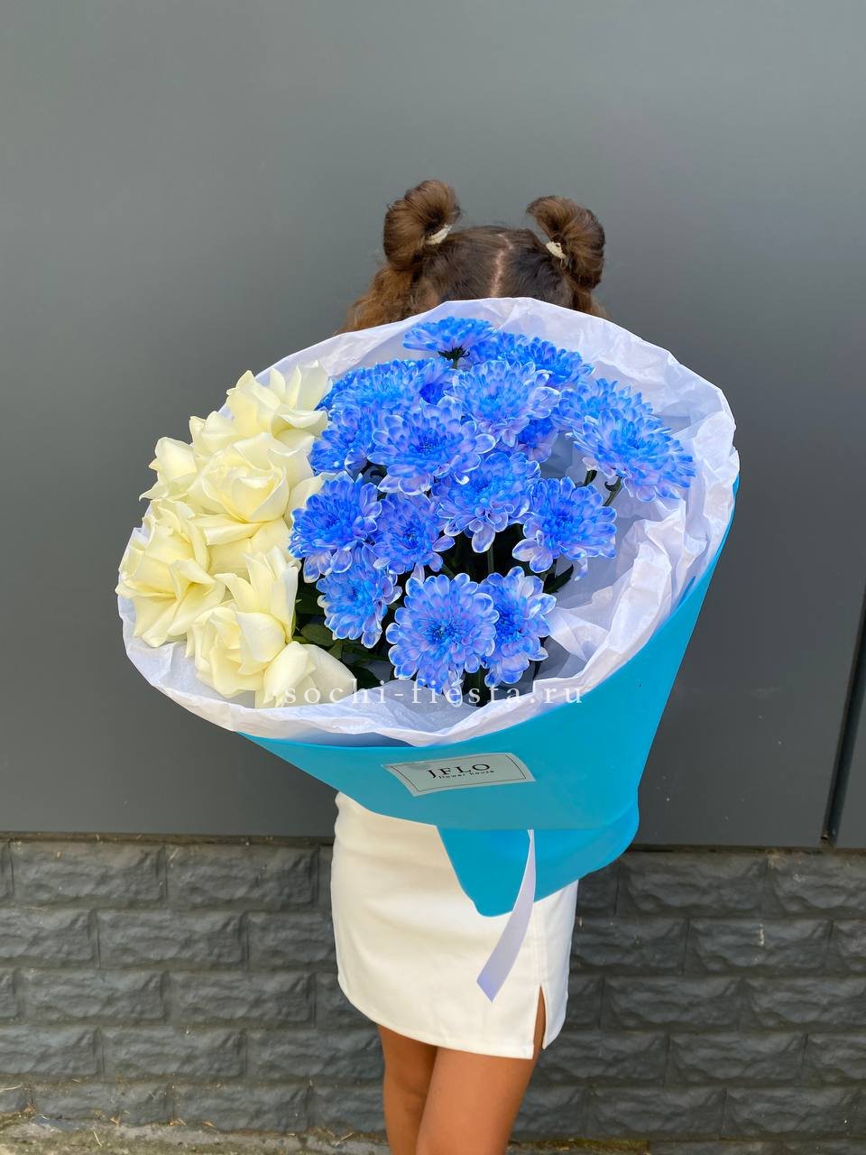 Белые розы и кустовая хризантема собраны в лаконичную форму. Светлая палитра и чистые линии букета подходят для любого повода и интерьера.
