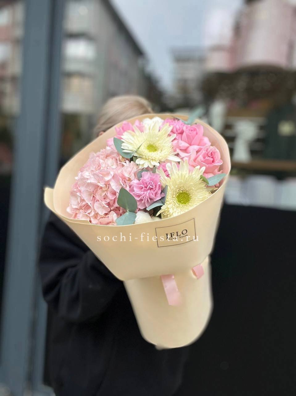 гербера, диантус, гортензия, бомбамстик, озатамус в нежном оформлении.