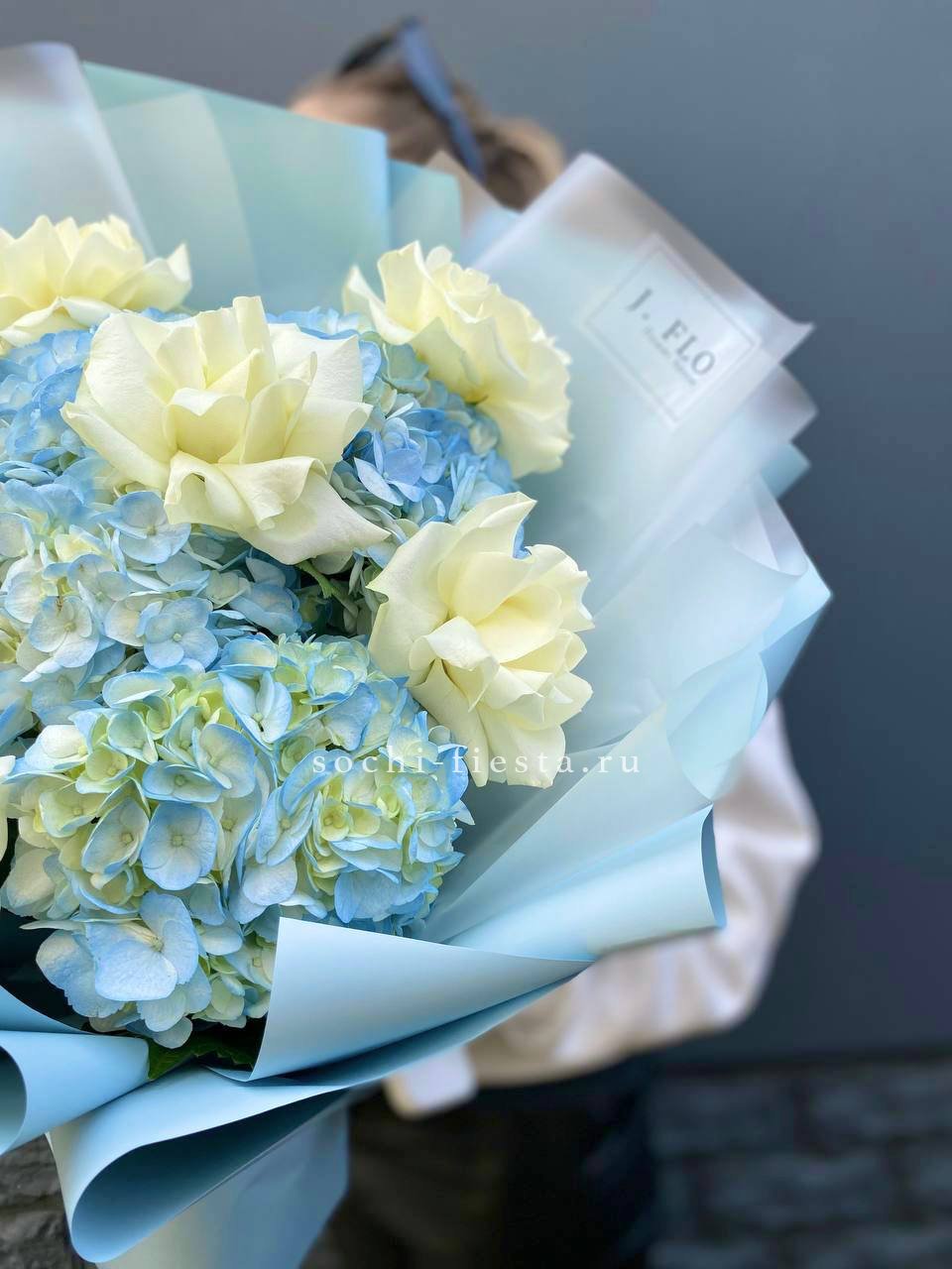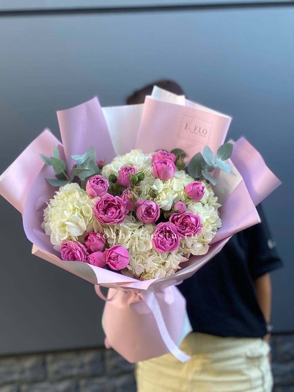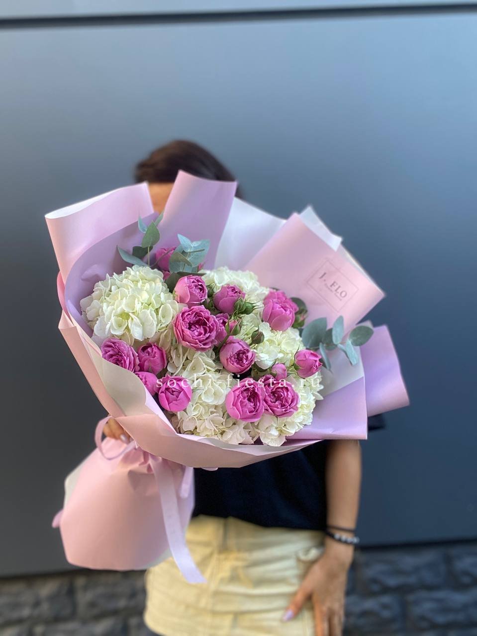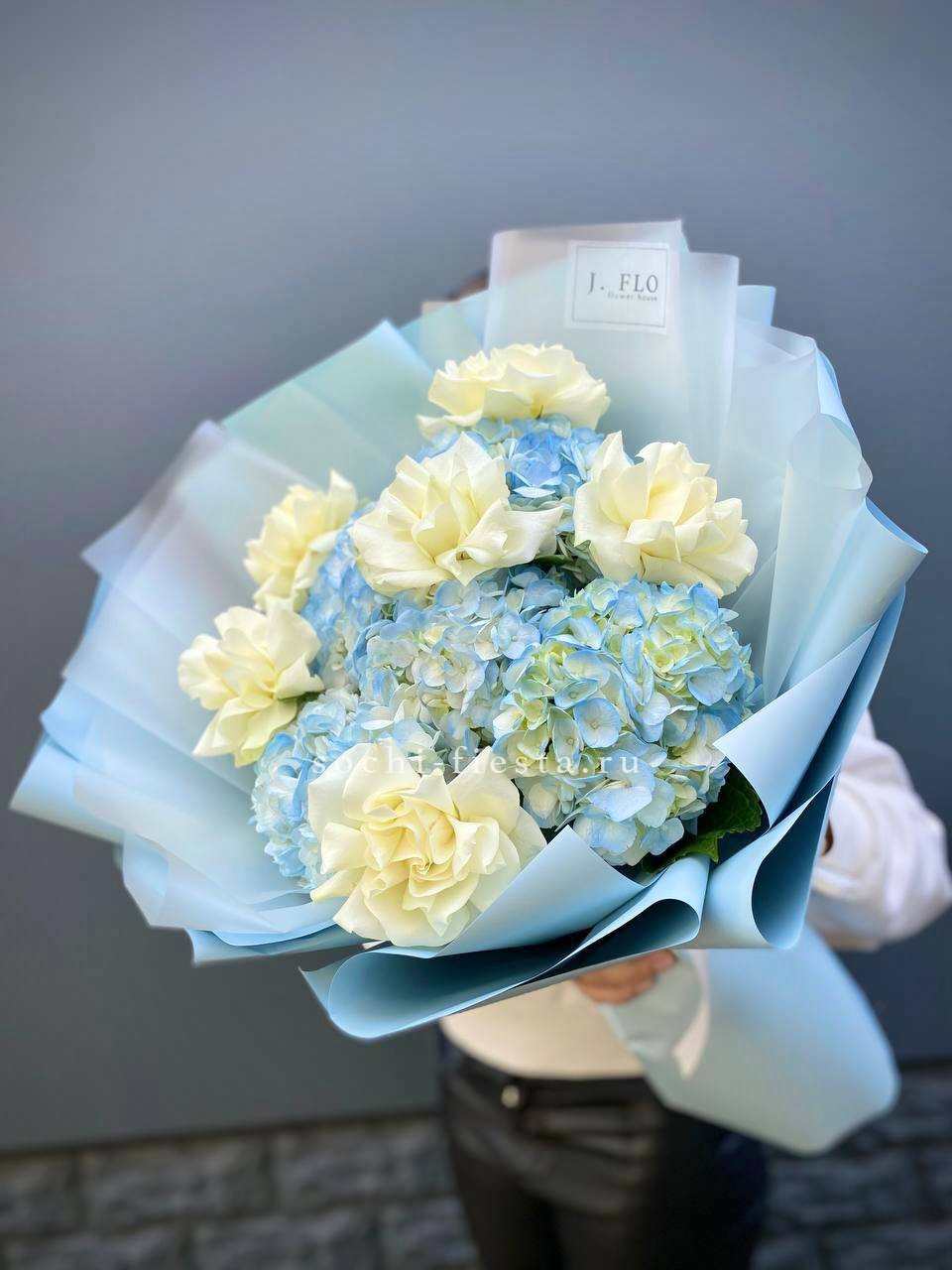 гортензия, розовые розы, кустовые розы, маттиолы,, лимониум лента и дизайнерская пленка.