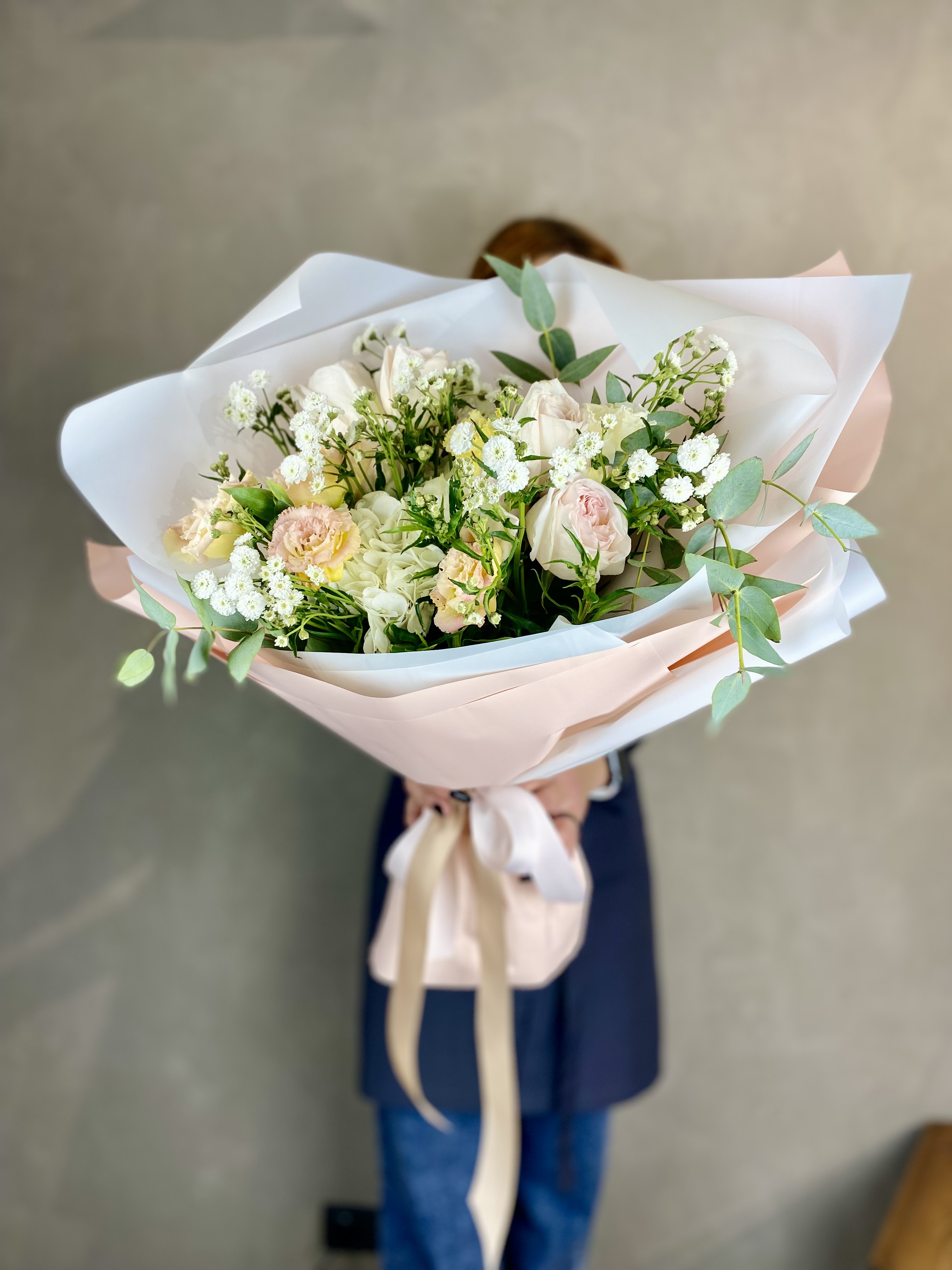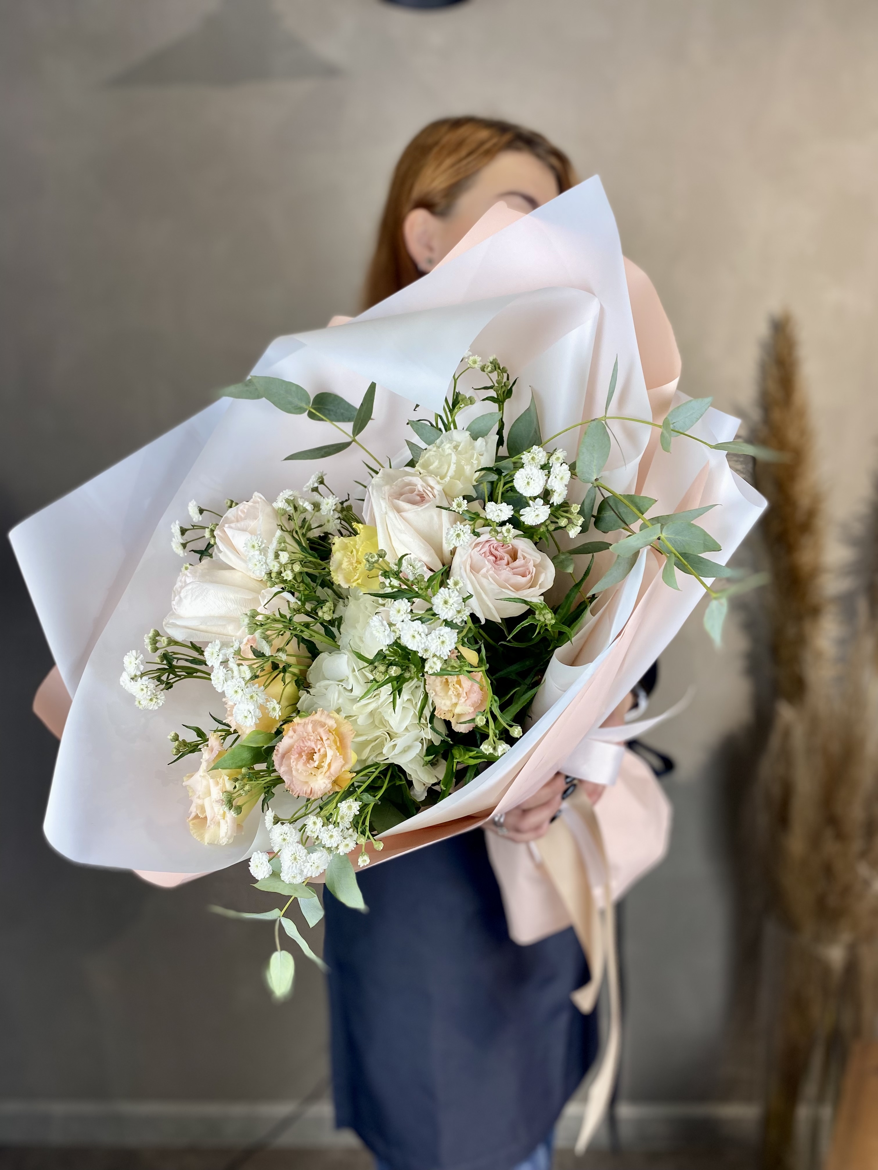 Этот пышный авторский букет напоминает нежное зефирное облако, в котором гармонично сочетаются объемные формы и изысканные оттенки. Композиция представляет собой микс из крупных соцветий гортензии и кустовых роз в пастельной гамме.