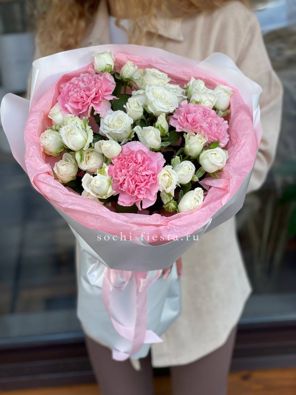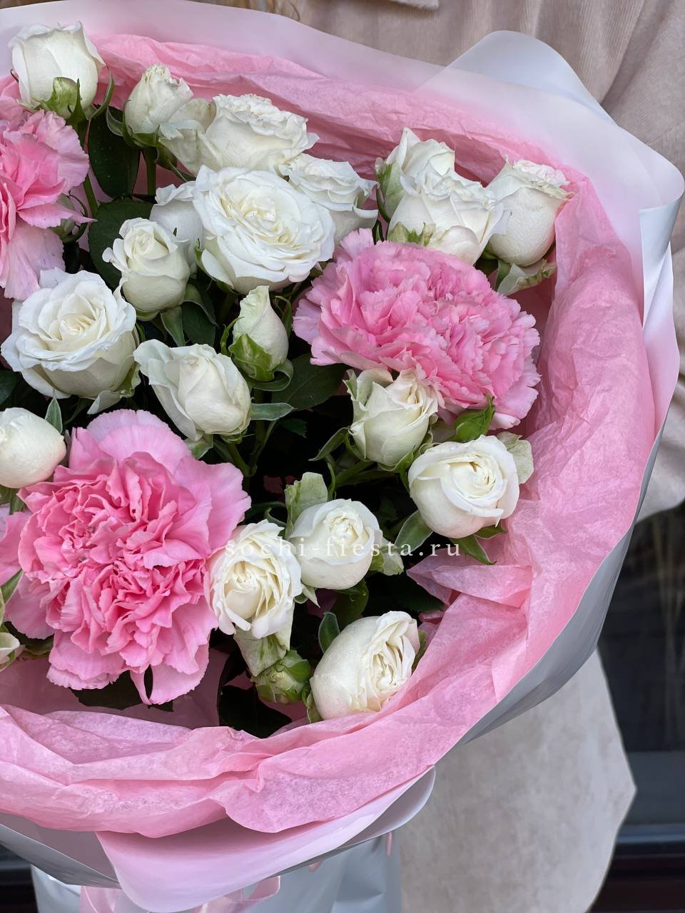 розовые розы, белые розы, диантус, бомбастик, гортензия, эвкалипт, пленка.