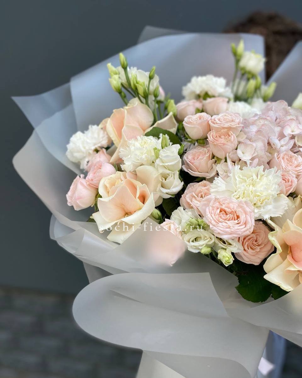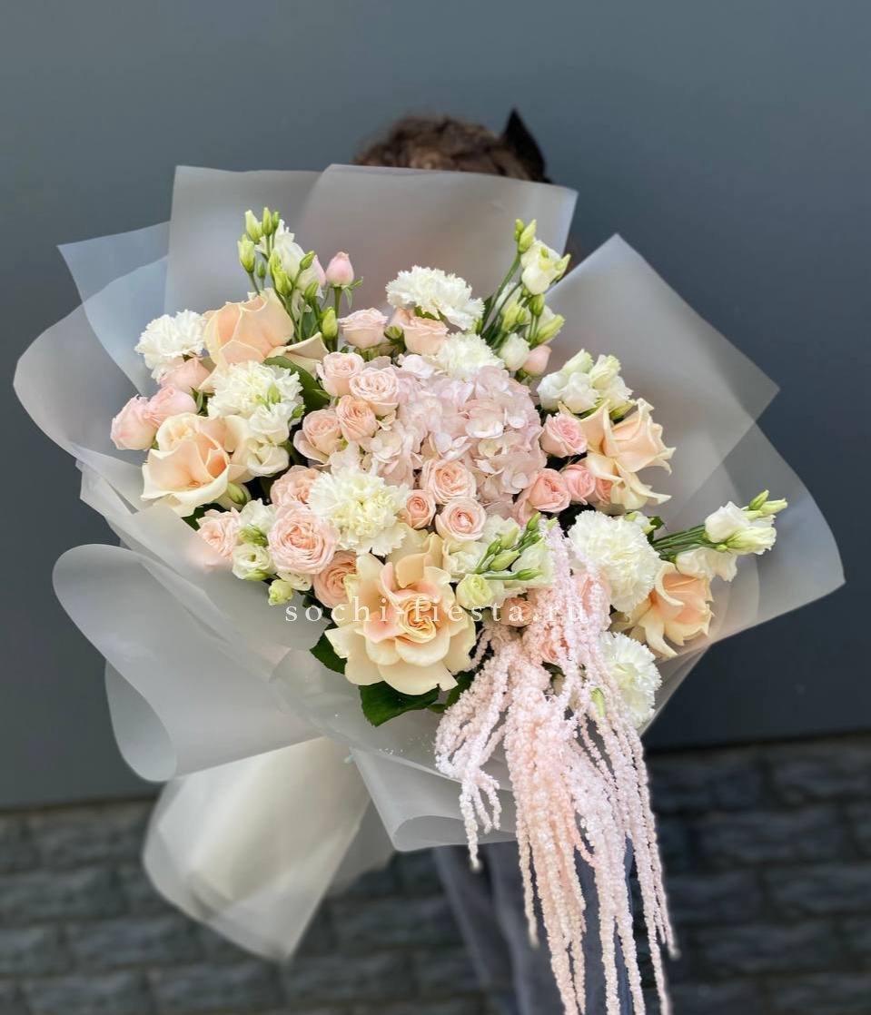 Пышная шапка из роз двух оттенков с объёмной гортензией и воздушным диантусом создаёт мягкий переход от белого к розовому. Бомбастик добавляет букету плотности, а эвкалипт освежает общую композицию. Универсальное решение для яркого поздравления.