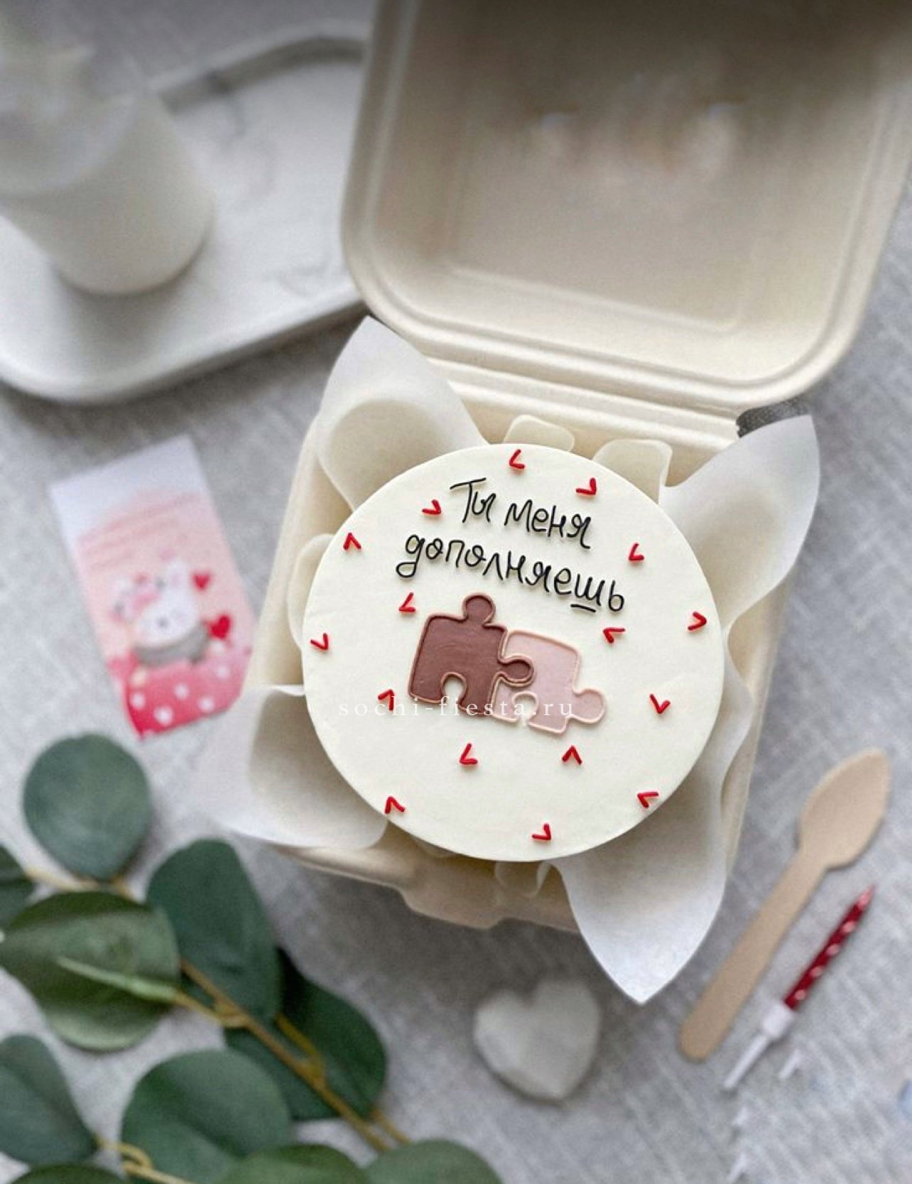 Компактный десерт с теплым посланием для близкого человека. Ручная работа видна в каждой детали крема и декора. Два вкуса начинки позволяют выбрать настроение этого дня.